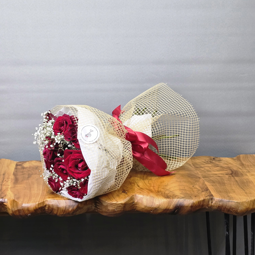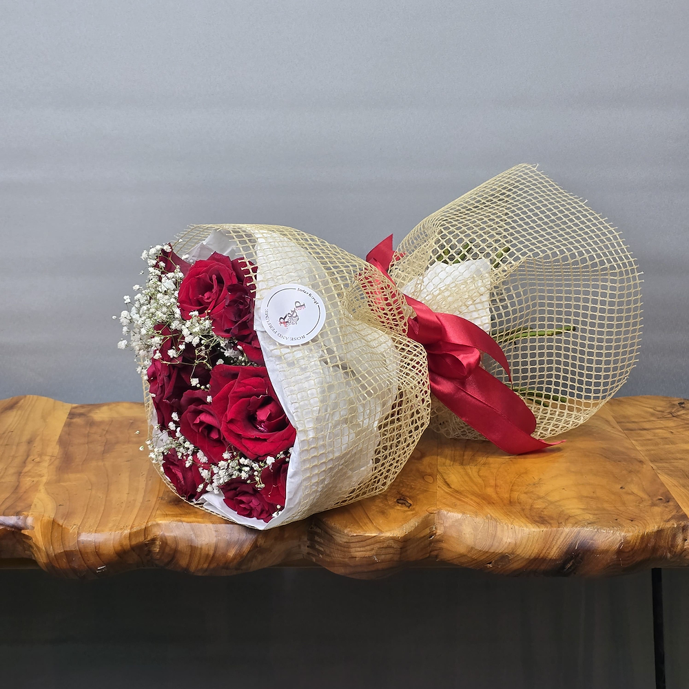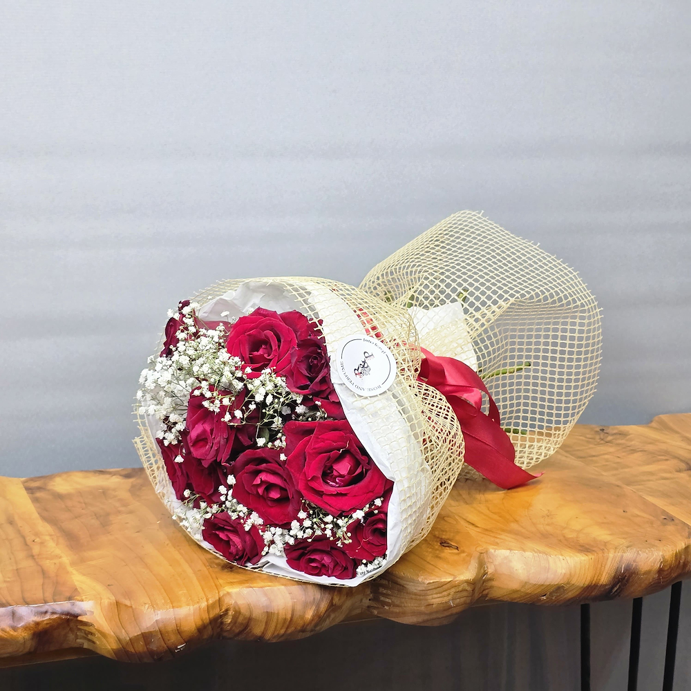 A bouquet featuring red roses wrapped with a special wrapping.