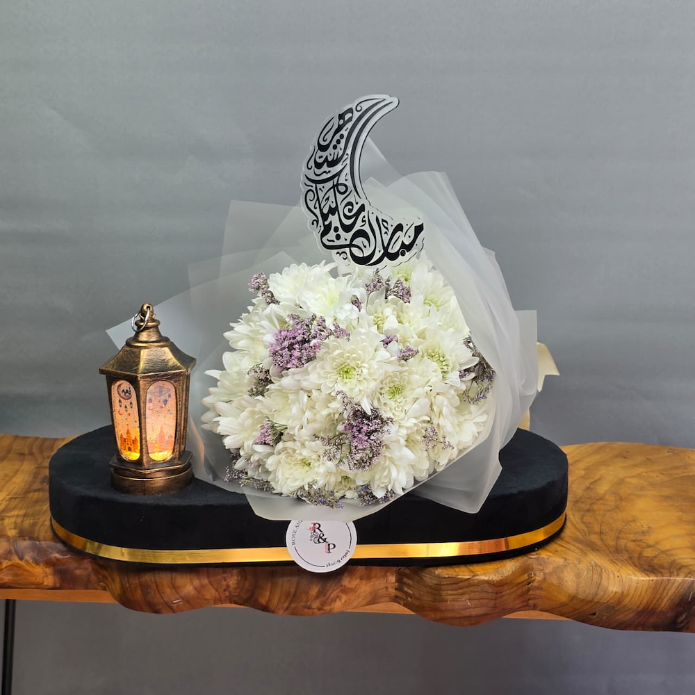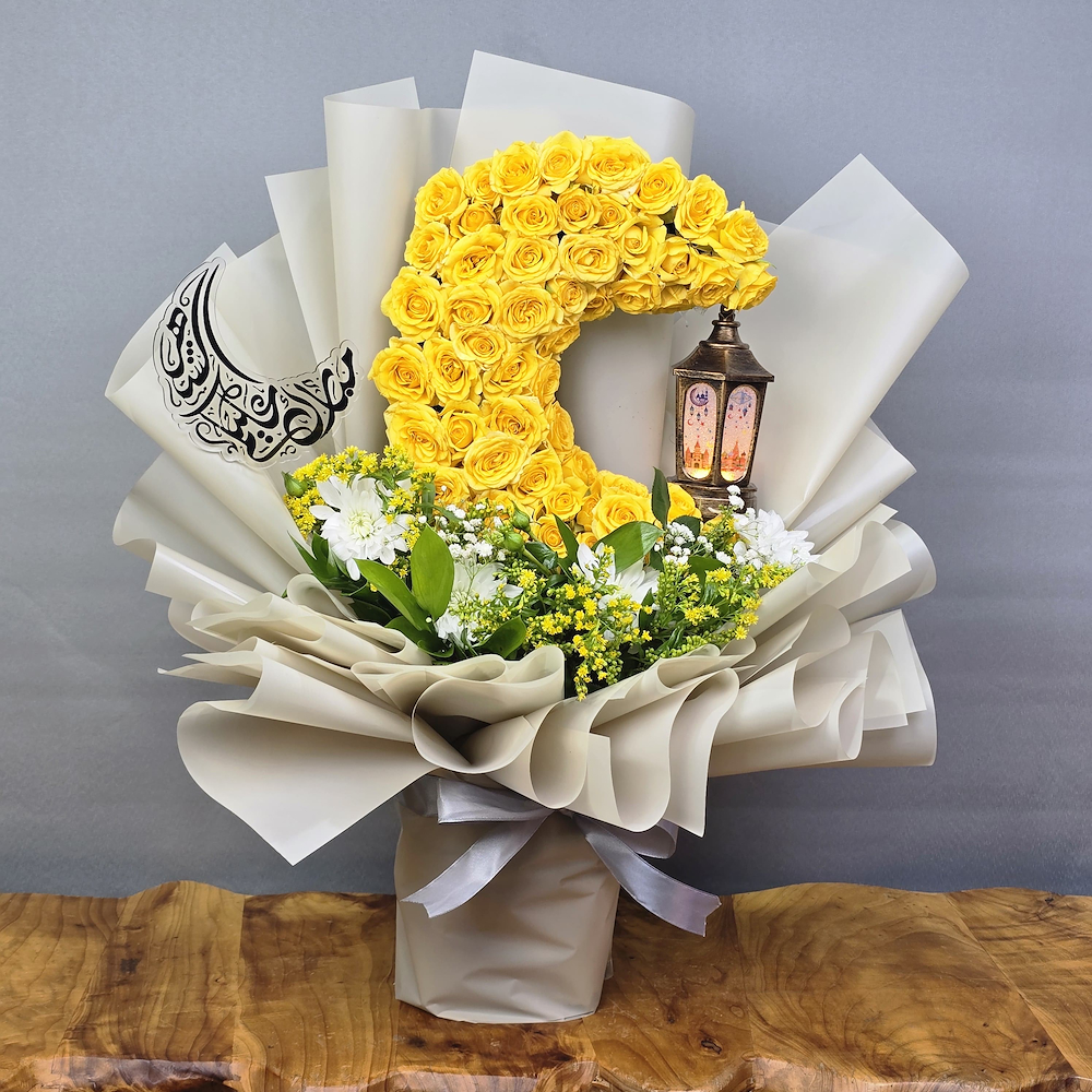 A bouquet featuring yellow baby yellow roses carefully arranged in Ramadan crescent theme.
