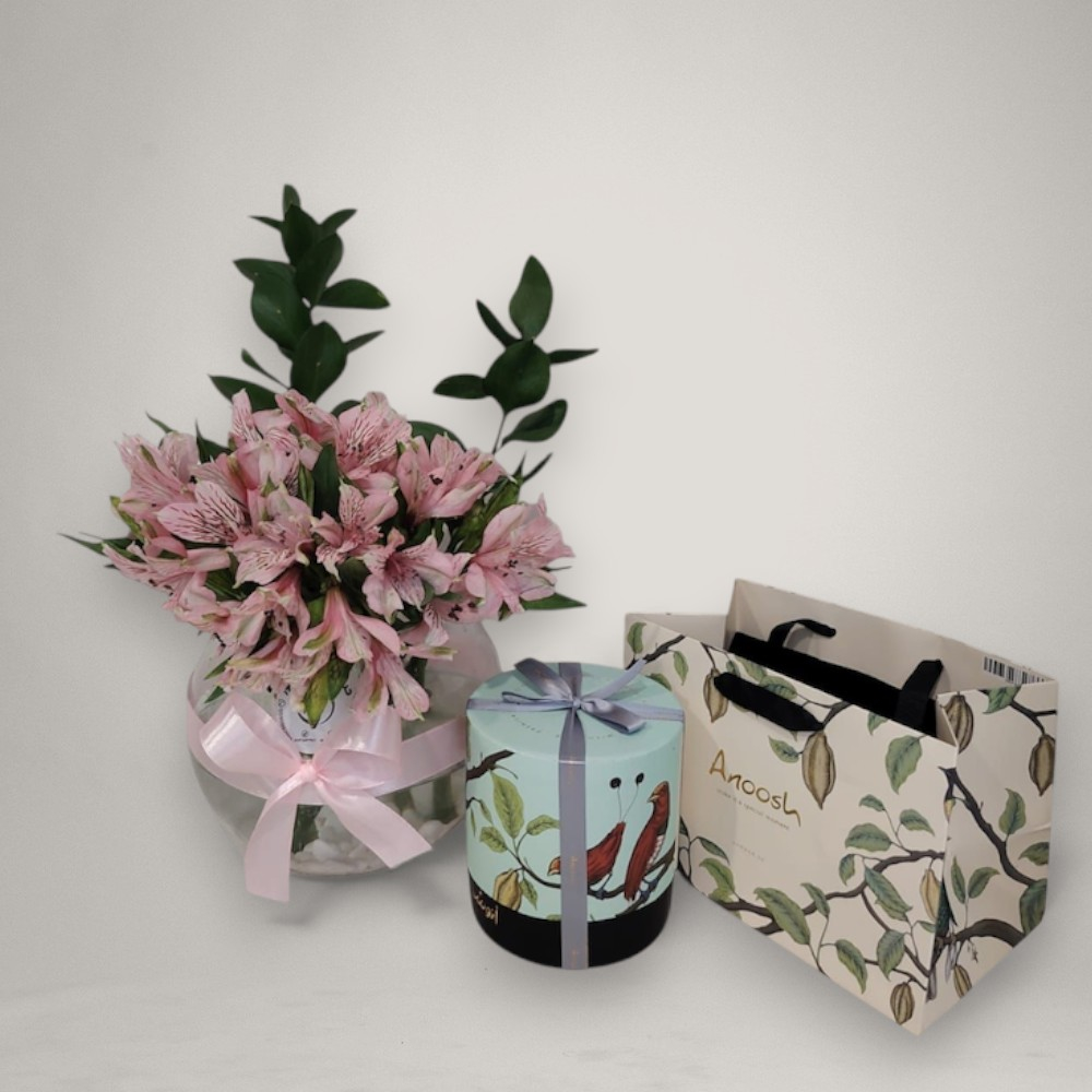 A vase filled with pink alstroemeria flowers with Anoosh chocolates.