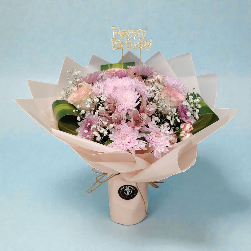 A bouquet consisting of pink cherries, roses, alstroemeria and gypsophila, which gives the bouquet its elegant and serene beauty with its sophisticated colors.