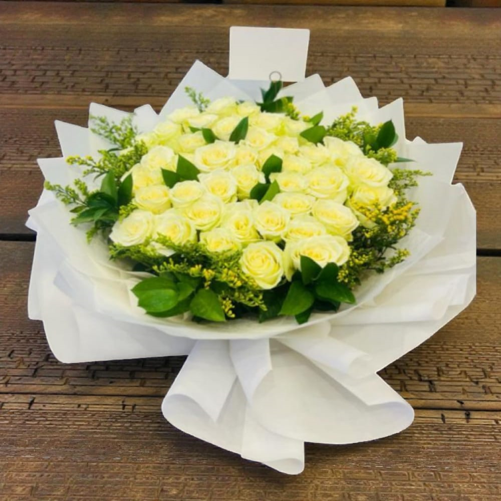 A beautifully arranged bouquet of white roses and Russian greenery, wrapped in white, symbolizes purity, peace, and new beginnings.