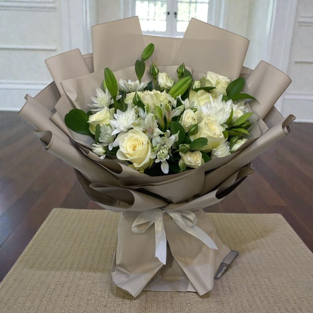 A hand bouquet that contains roses, lilies and chrysanthemums.