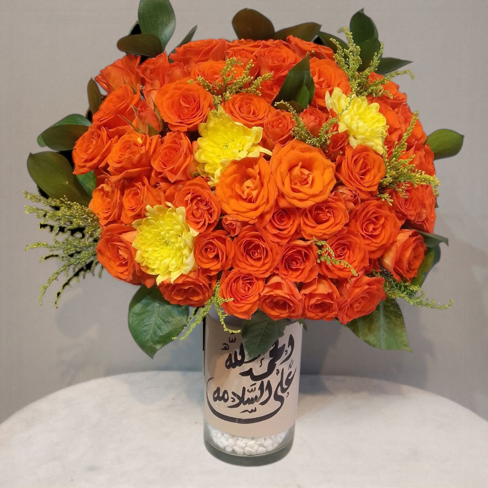 An elegant gift combining distinction and luxury, where Dutch cherry blossoms shine amidst elegant orange roses and lush leaves, all placed in a clear glass vase adorned with the words "Thank God for your safe return."