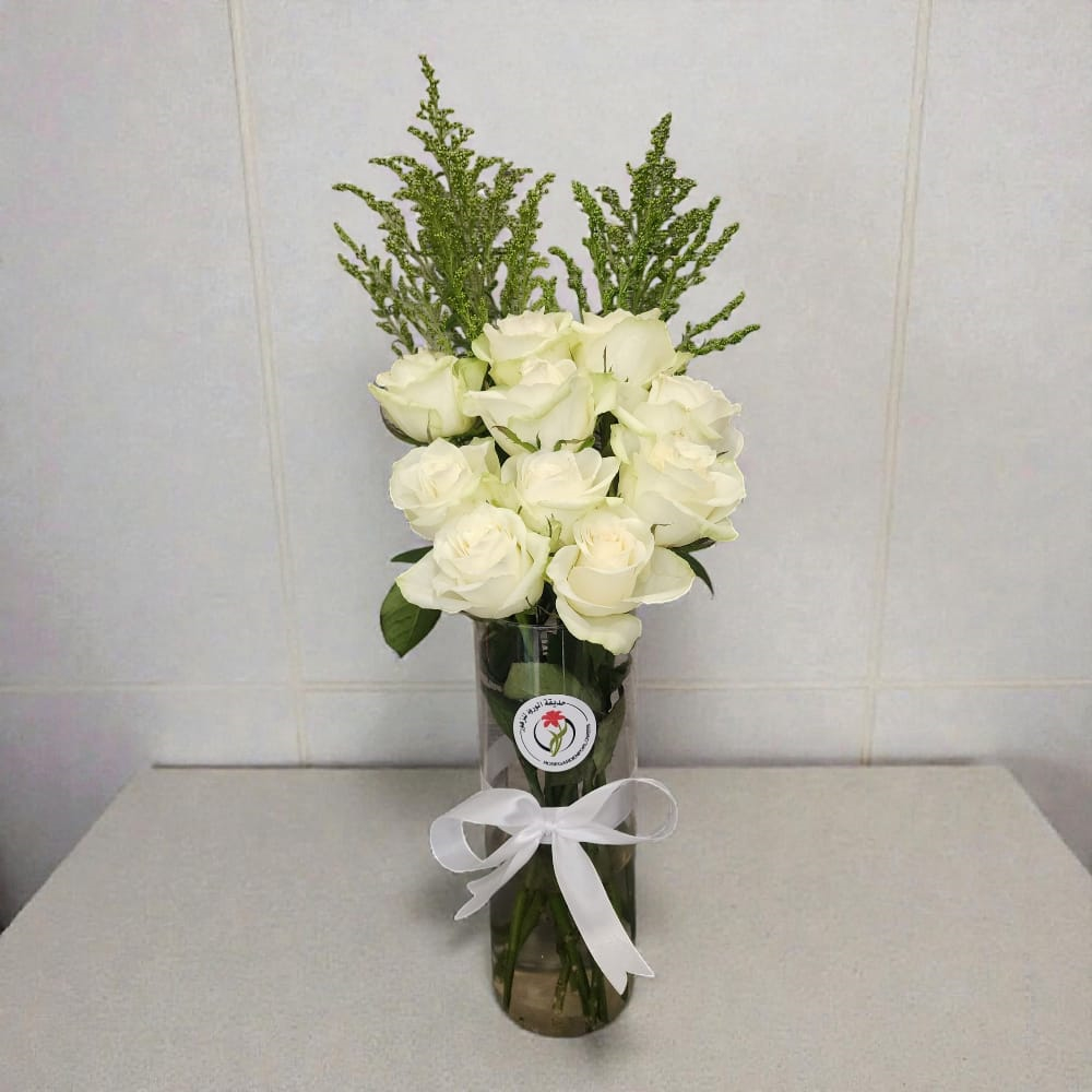 A vase of white roses with a modern design, exuding purity and sophistication.