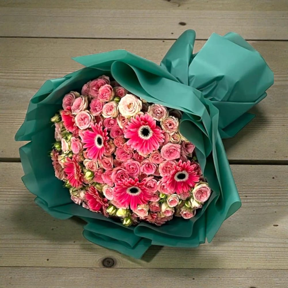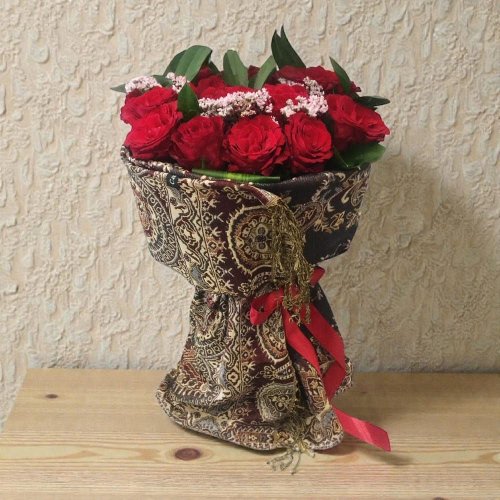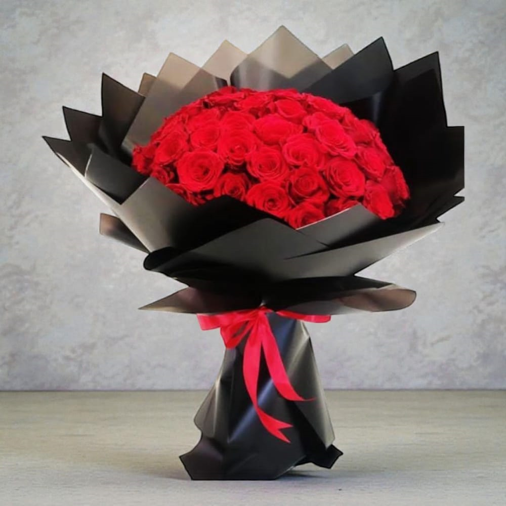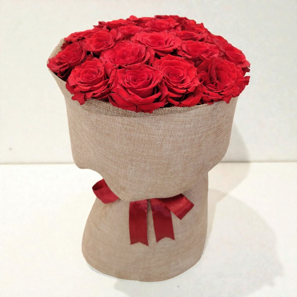 A large and attractive bouquet of red roses, wrapped in a rustic chic style.