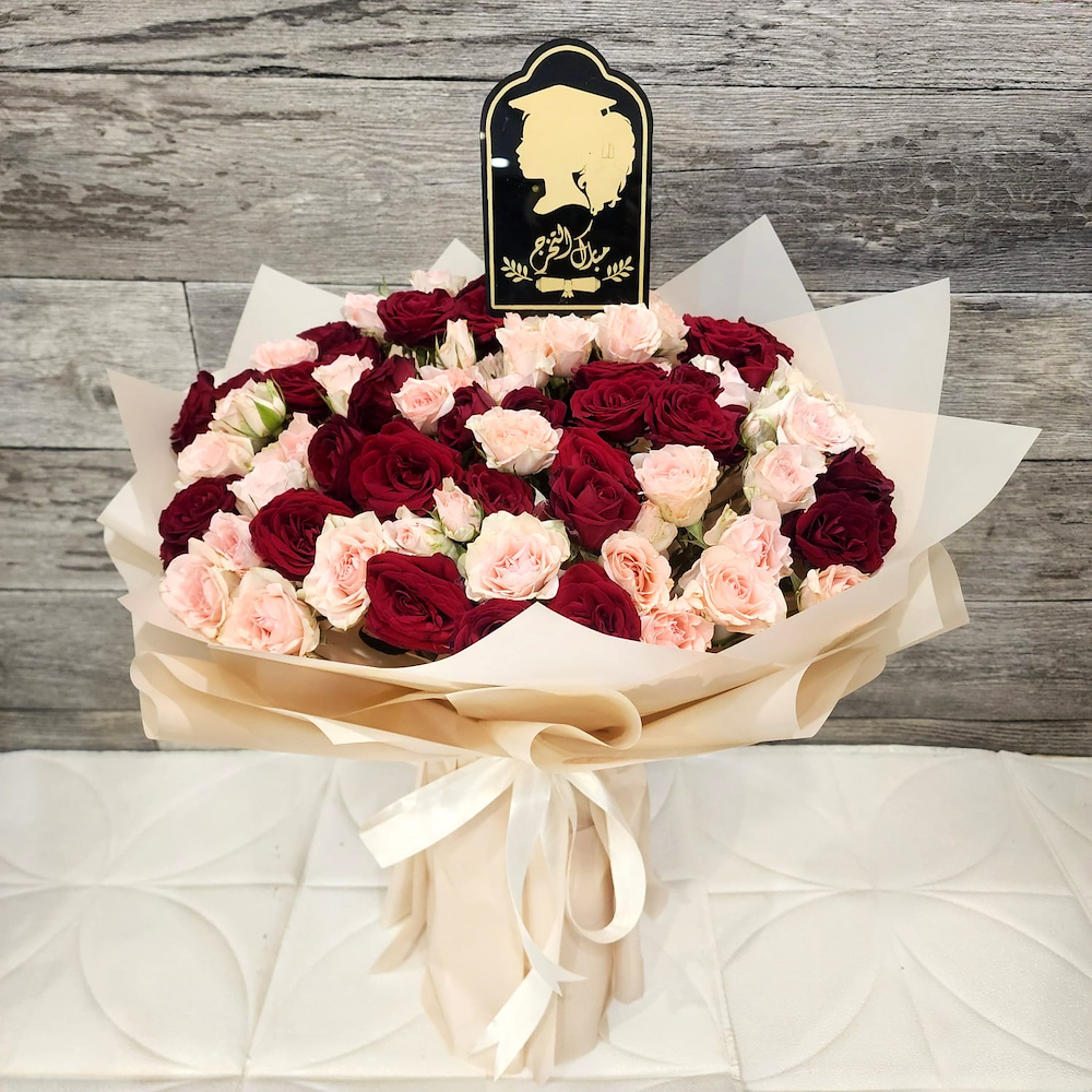 A joyful bouquet featuring baby roses in burgundy and pink, giving beauty and delight to a refined gift.