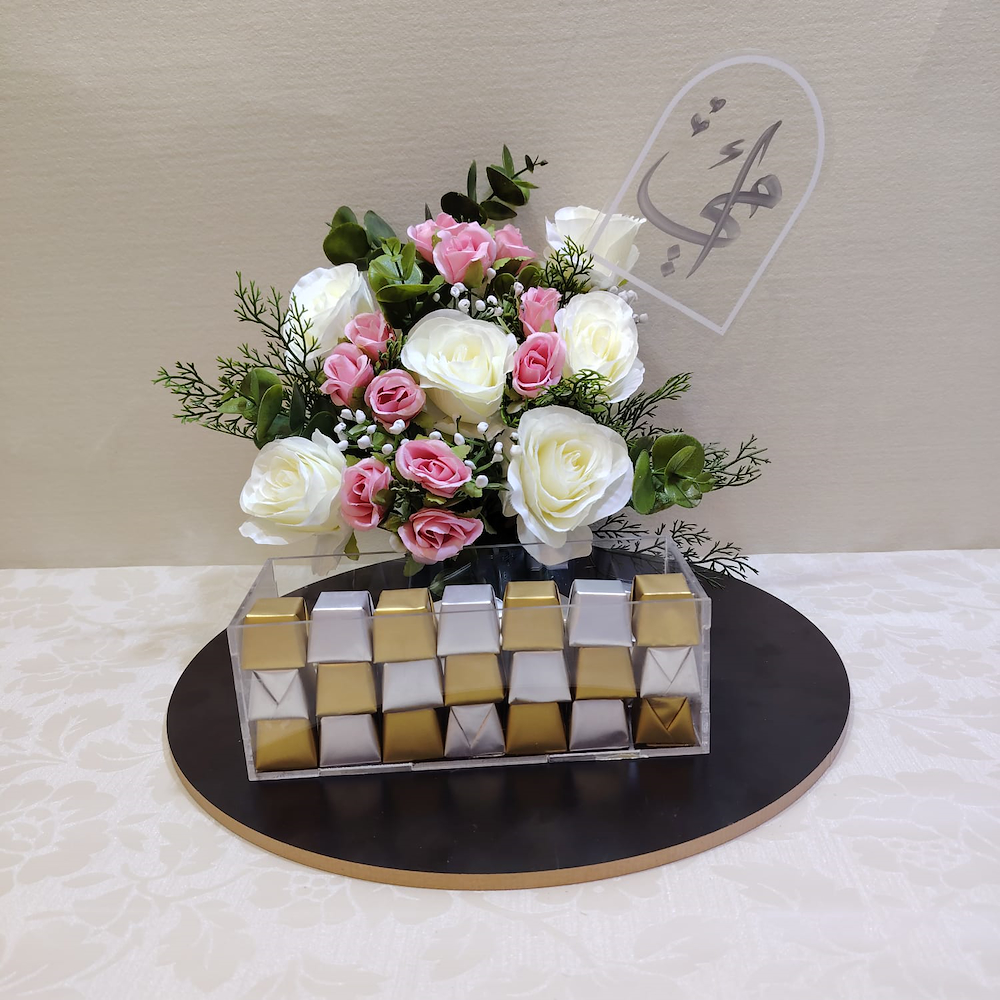 A wooden stand featuring white and baby pink rose petals, and the rose stand is adorned with luxurious chocolates and a "Mom" topper.