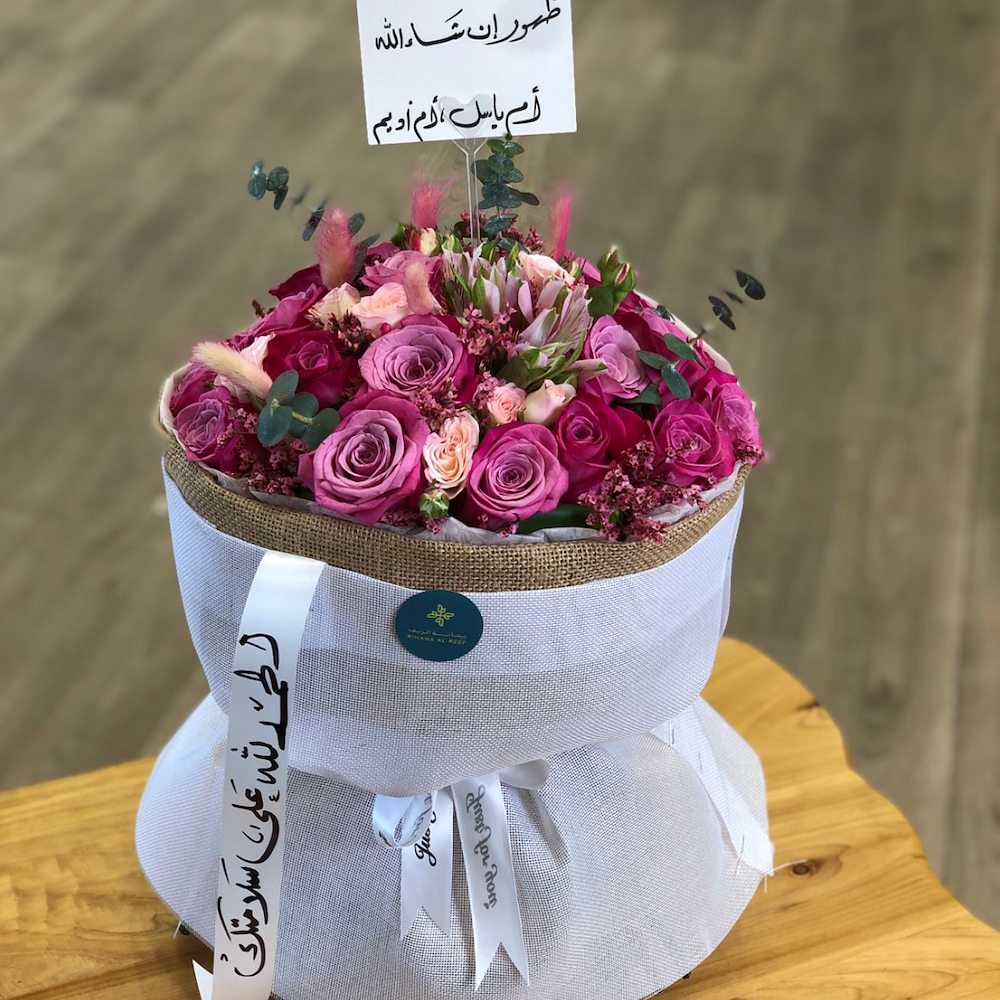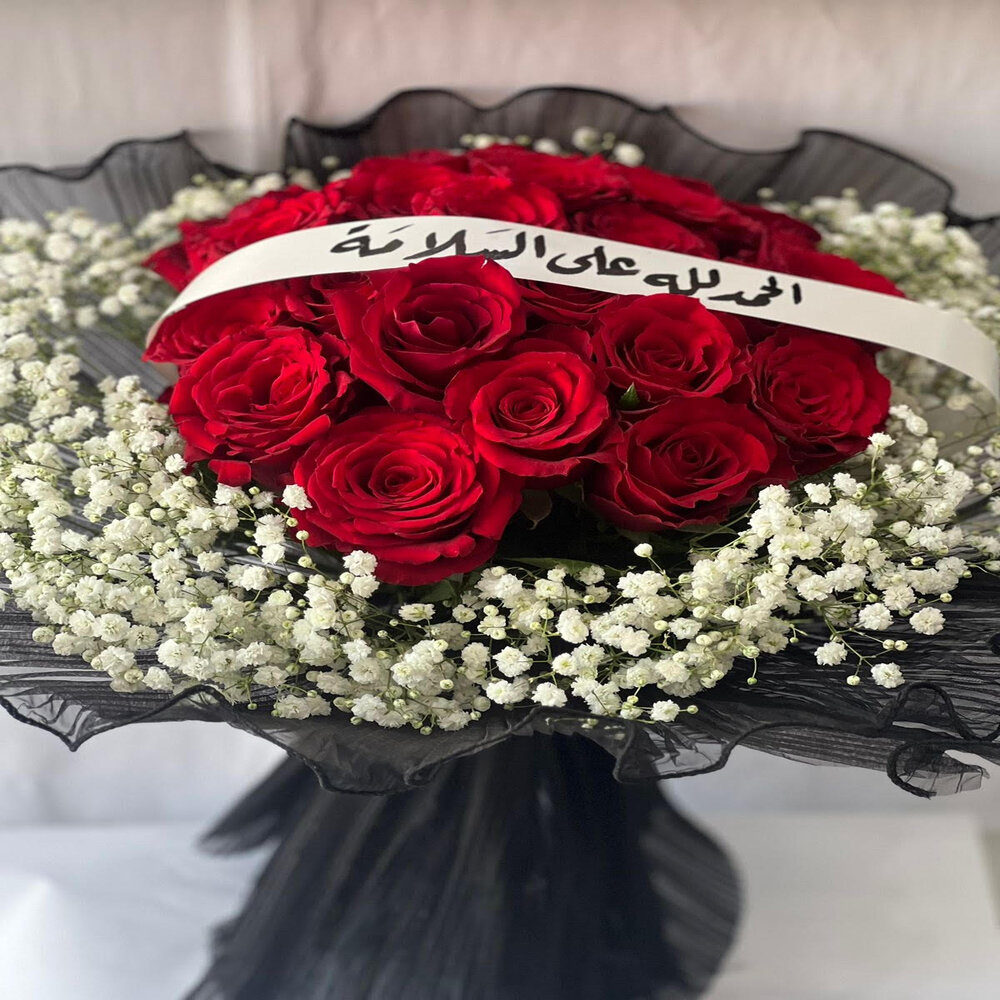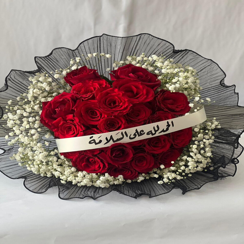 A fabric bouquet consisting of red roses and gypsophila branches with the phrase Thank God for your safety.