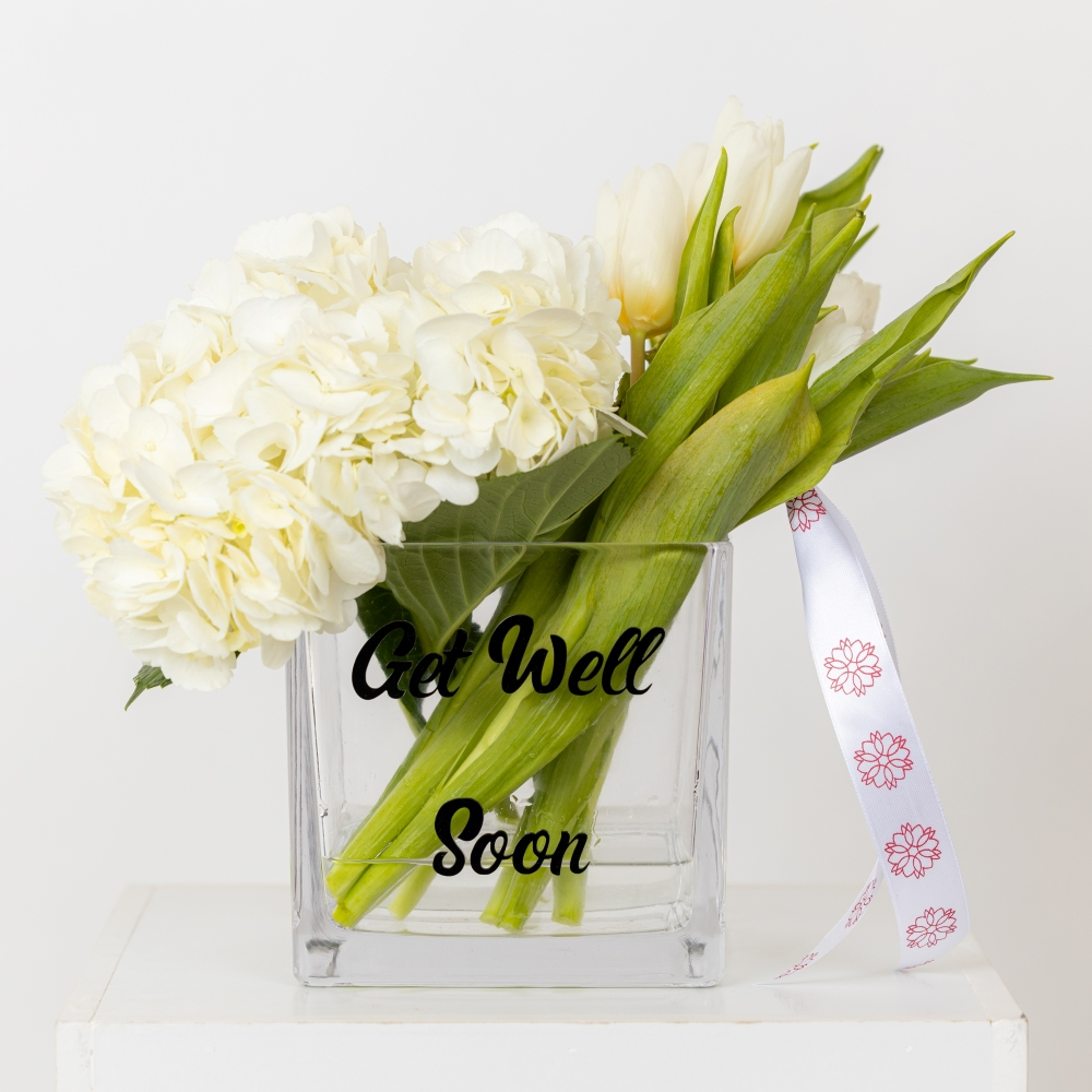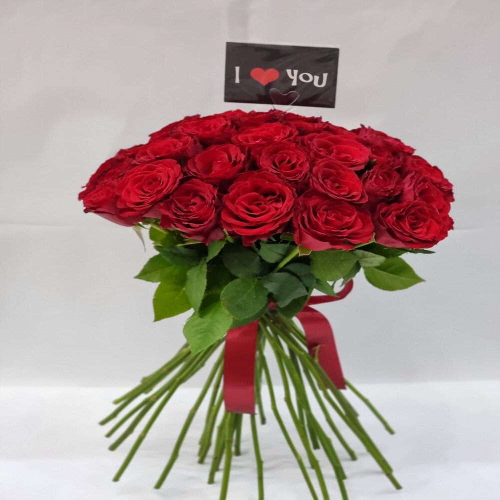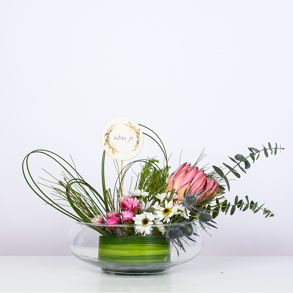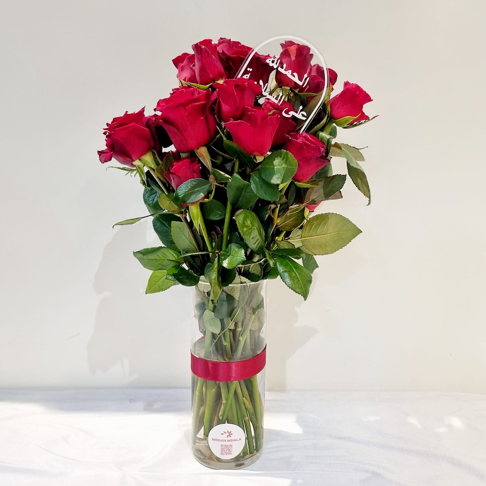 A fabric bouquet consisting of red roses and gypsophila branches with the phrase Thank God for your safety.