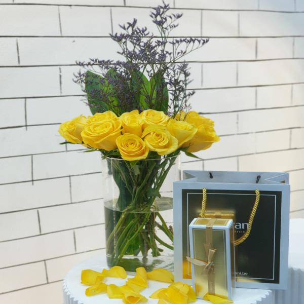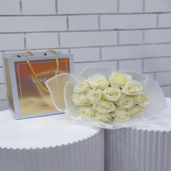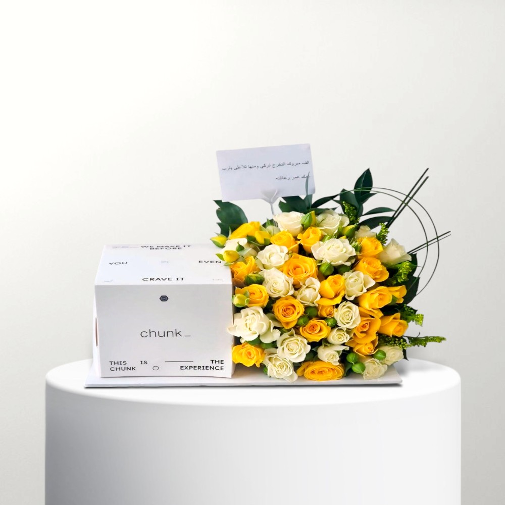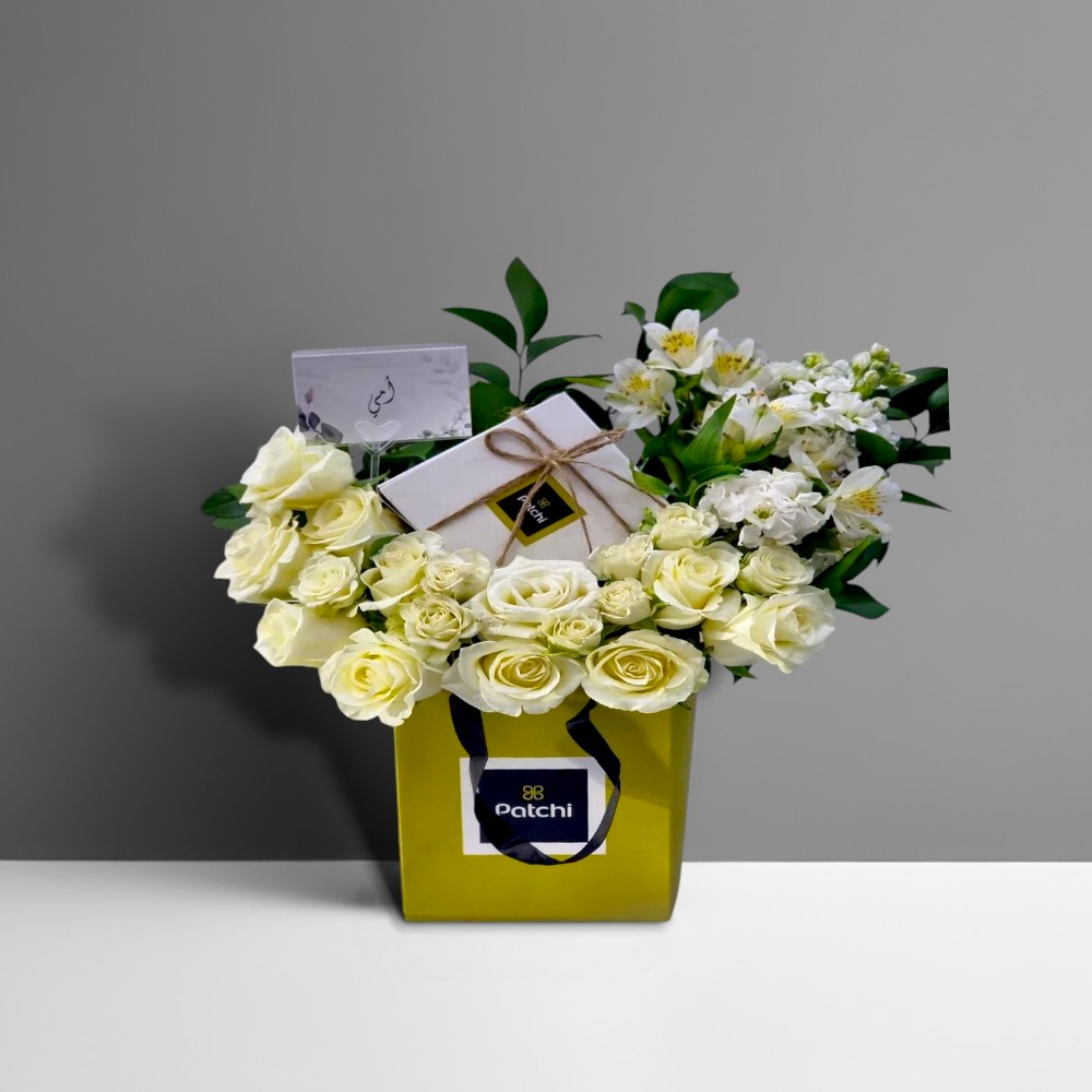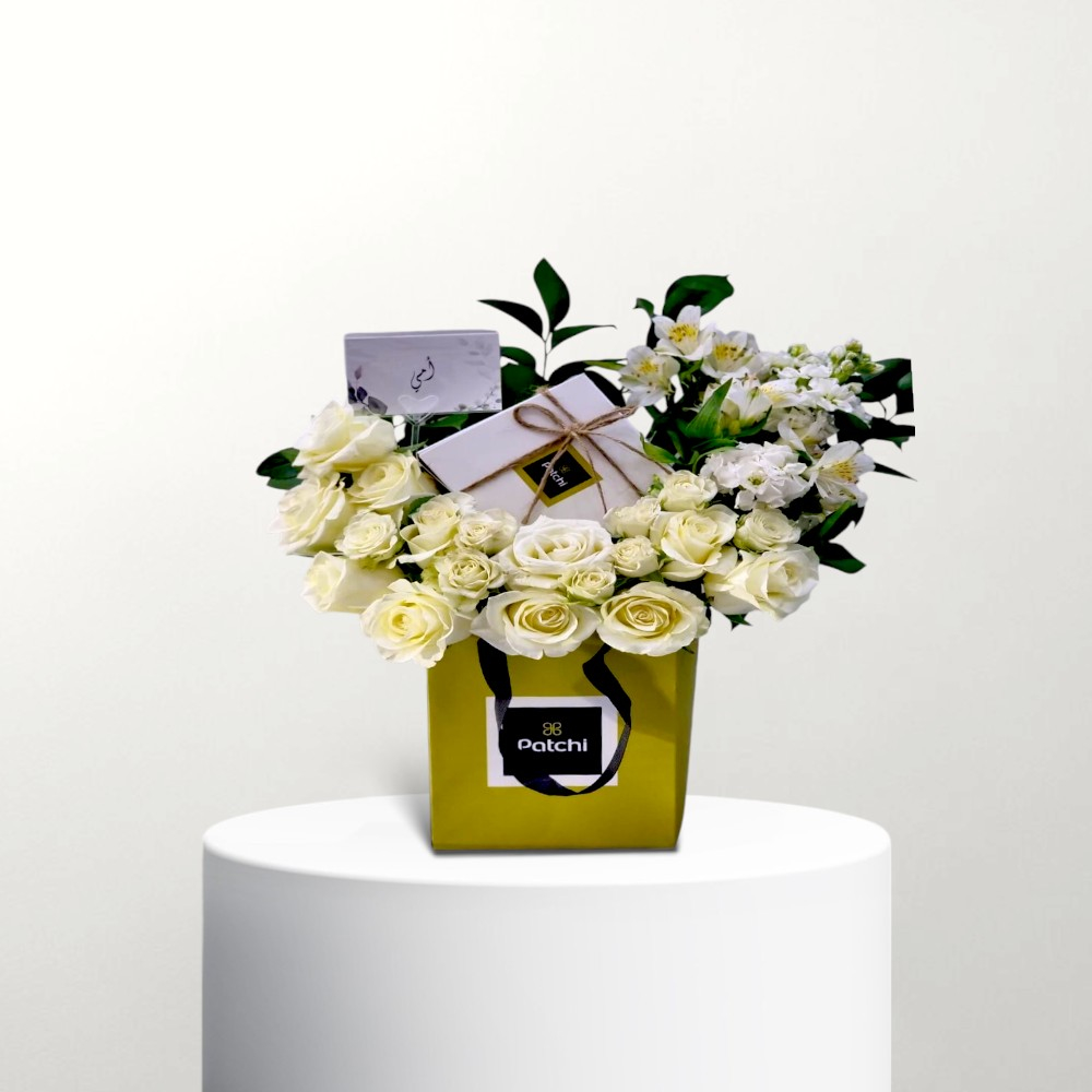 White roses and baby roses with Dutch statice and 250g of chocolates from Patchi.