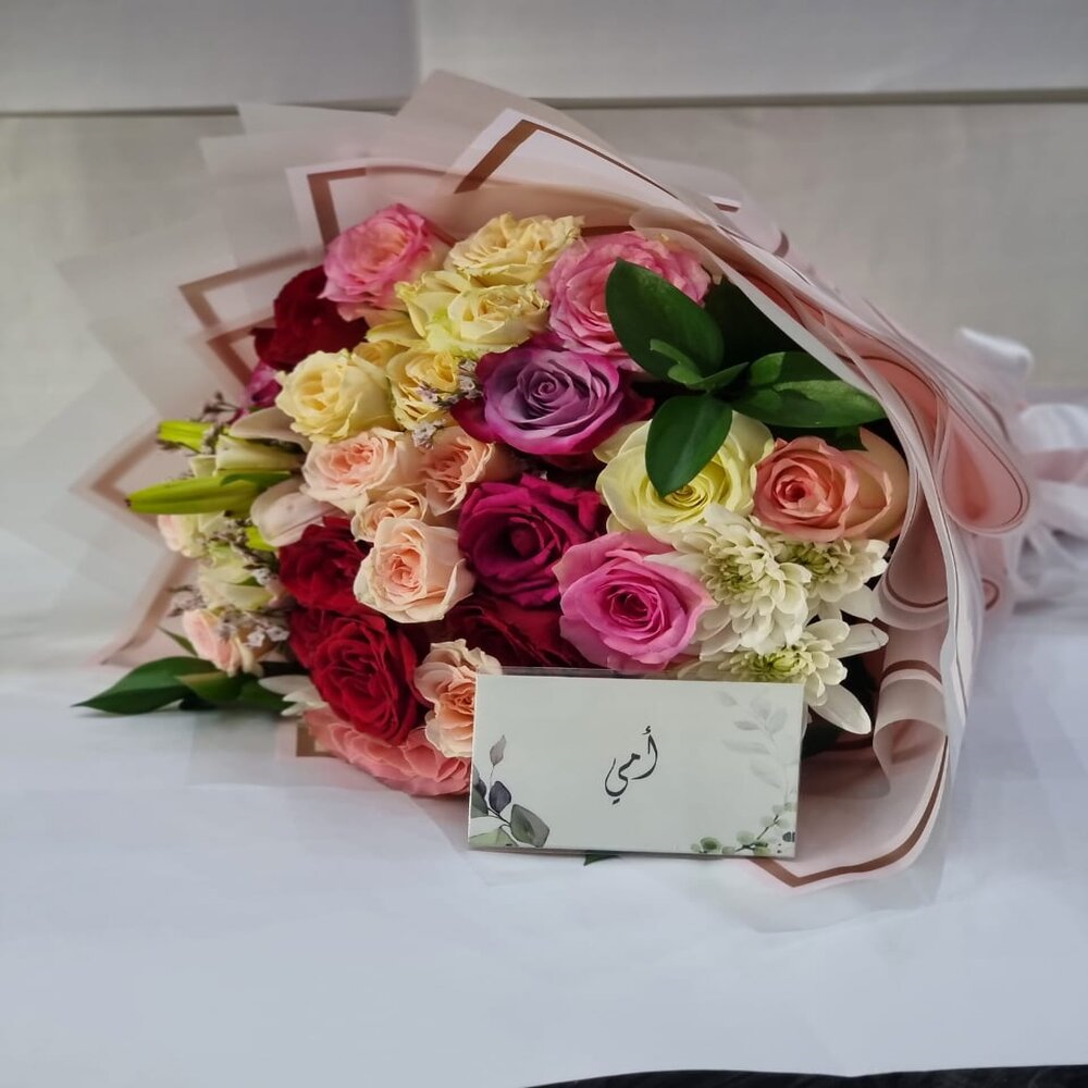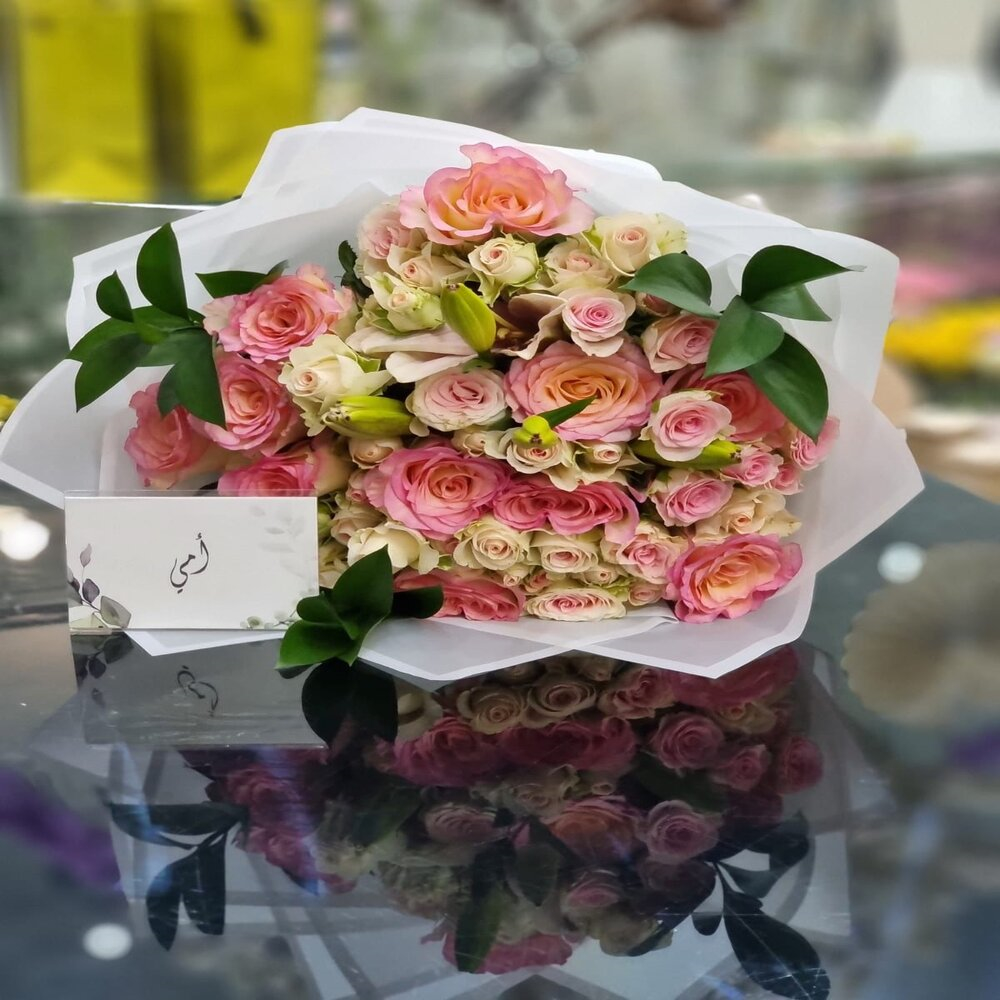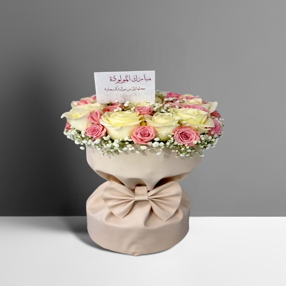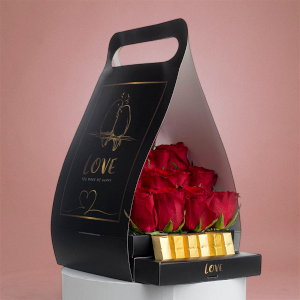White roses and baby roses with Dutch statice and 250g of chocolates from Patchi.