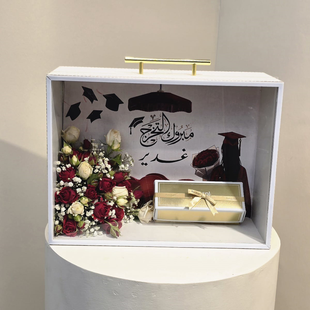 A box that contains roses and gypsophila along with chocolates from Bostani.