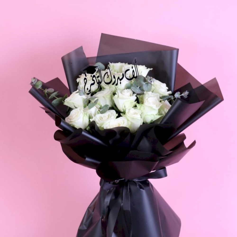 A bouquet filled with white roses, with a special wrapping.