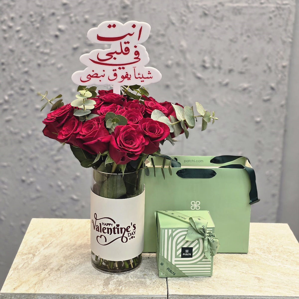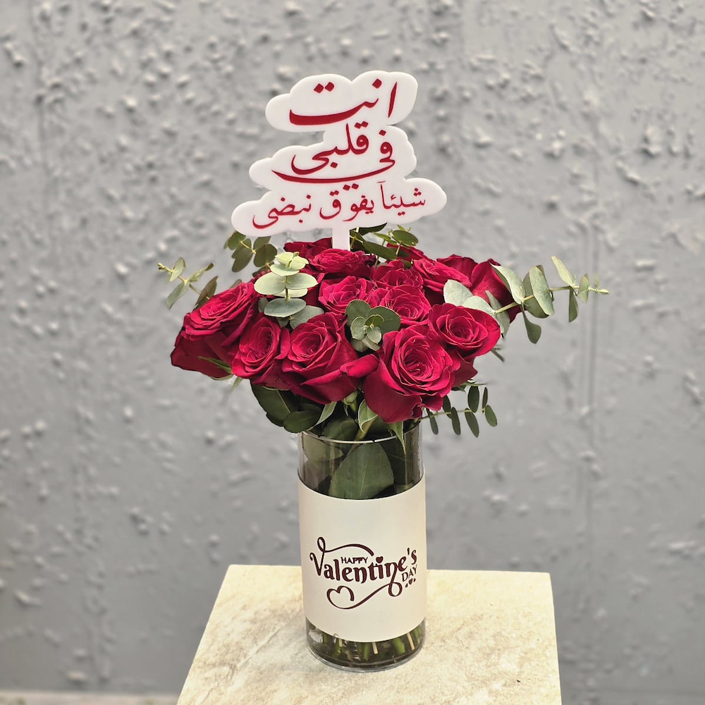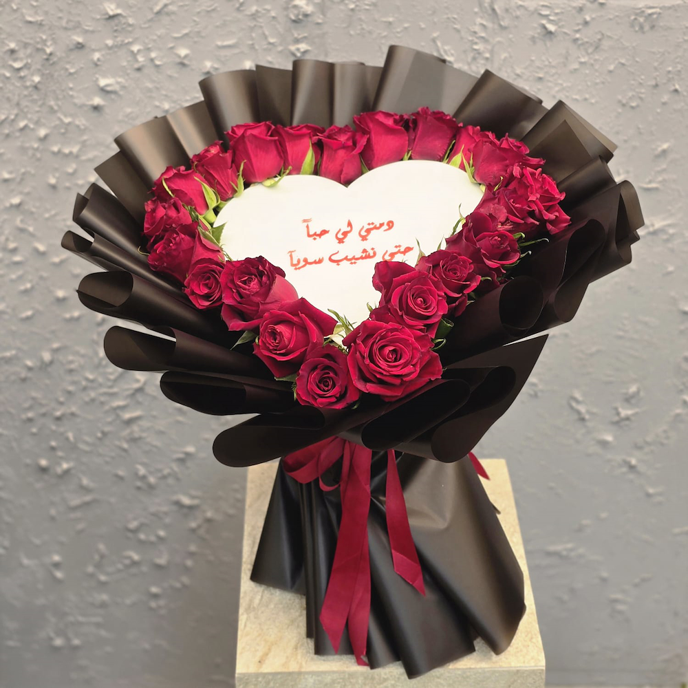 An elegant bouquet featuring red heart of red roses with a love day message in elegant black wrapping.