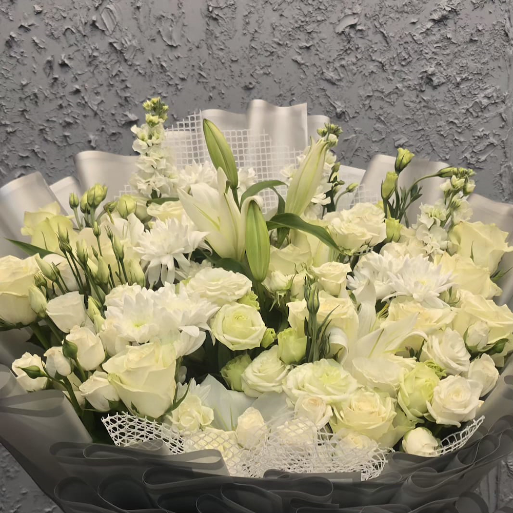 This delicate bouquet, with its elegant details, blends shades of white, including roses, baby roses, chrysanthemums, and lilies, radiating captivating beauty.