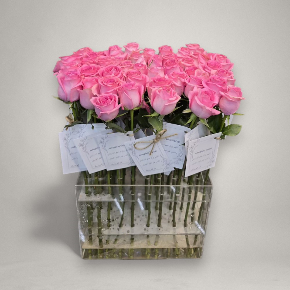 An acrylic base filled with 50 roses giveaways and a card for each one.