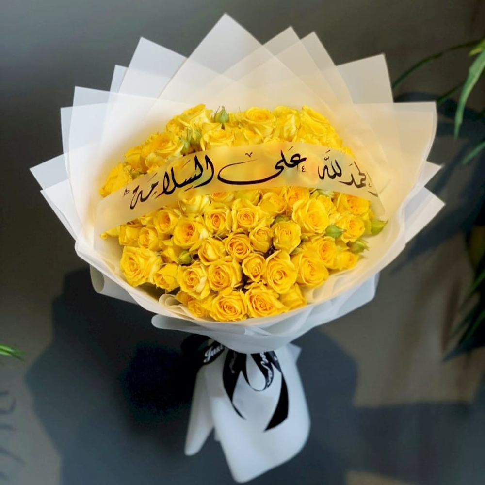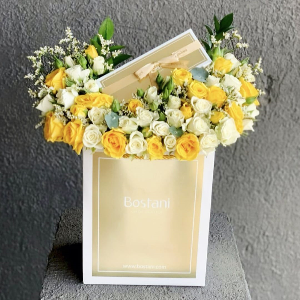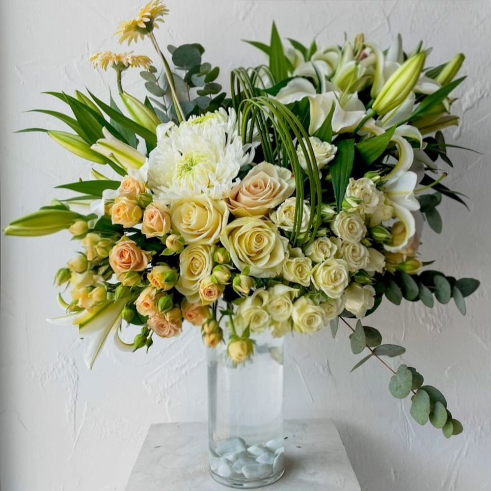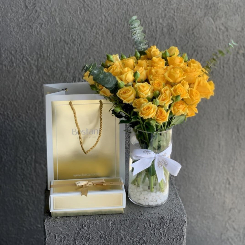 A vase filled with baby yellow roses, eucalyptus branches, and a quarter kilo of garden chocolates.