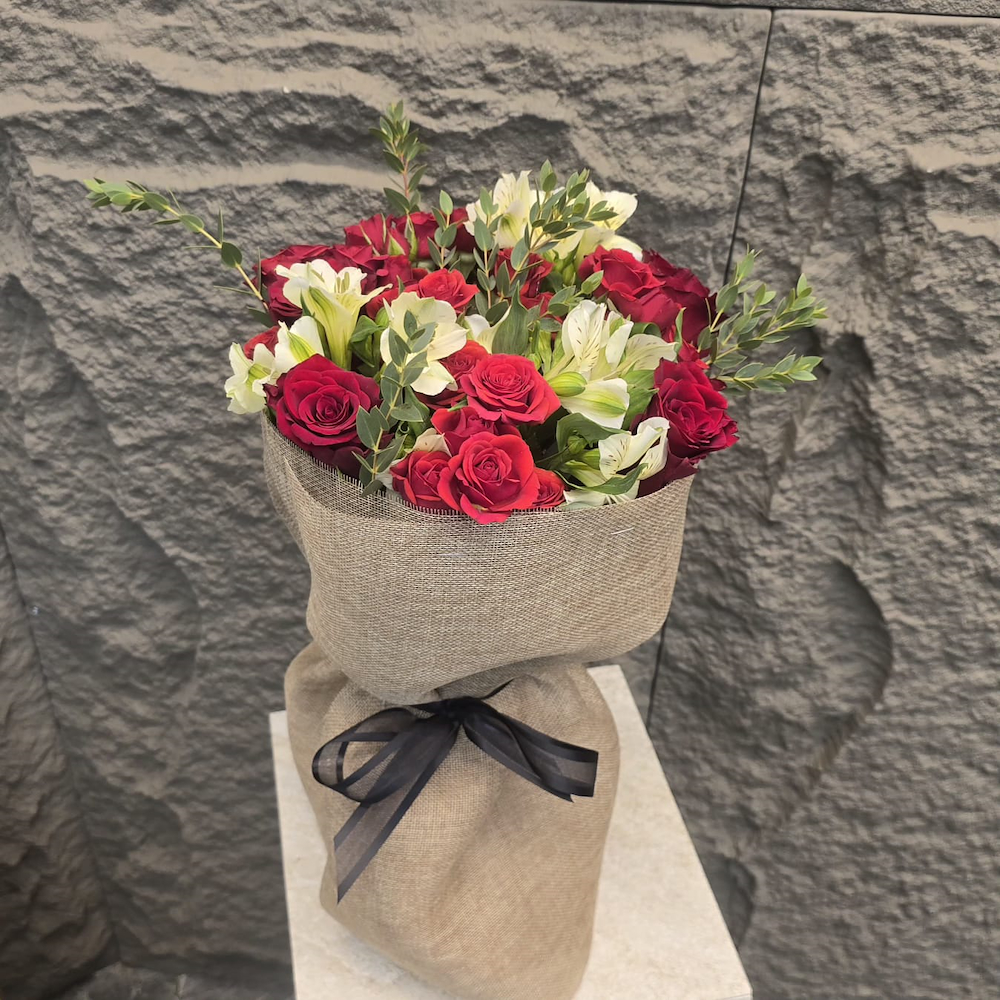 Tulin bouquet of red roses, red baby roses, and white alstroemeria in a unique arrangement.