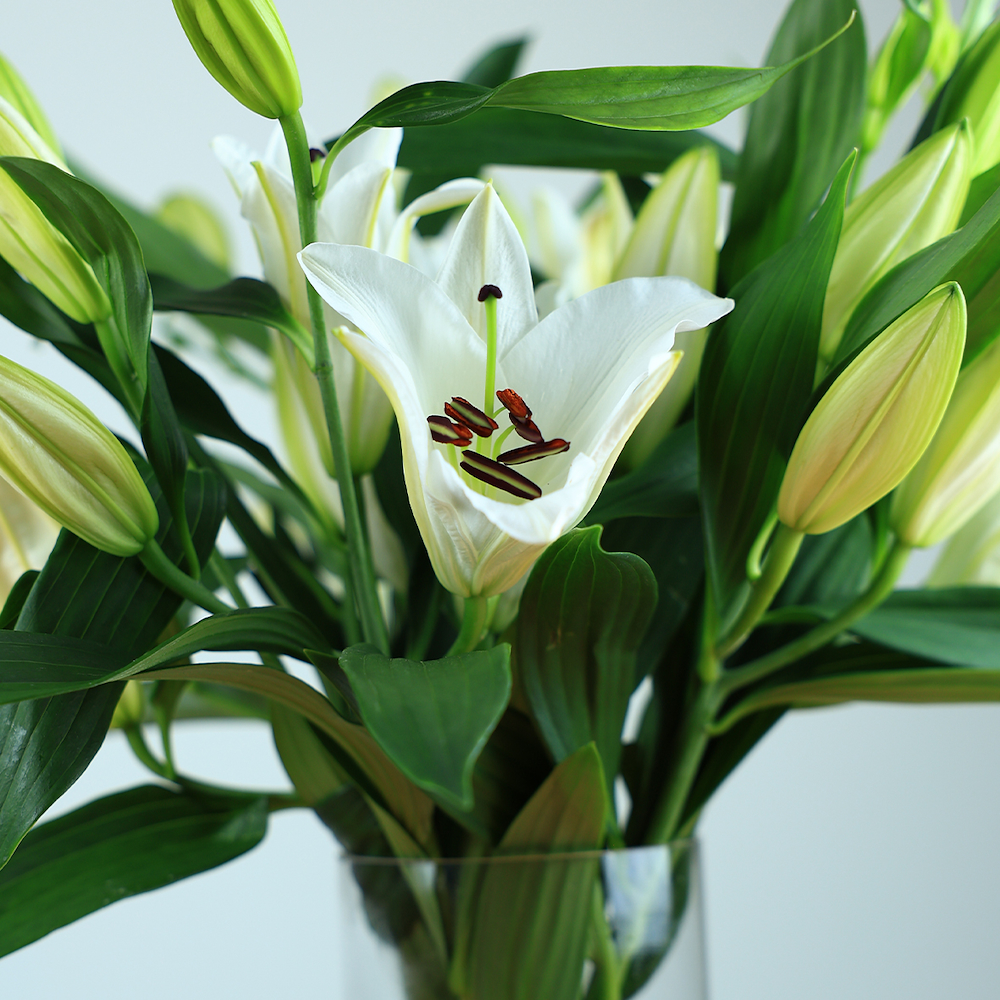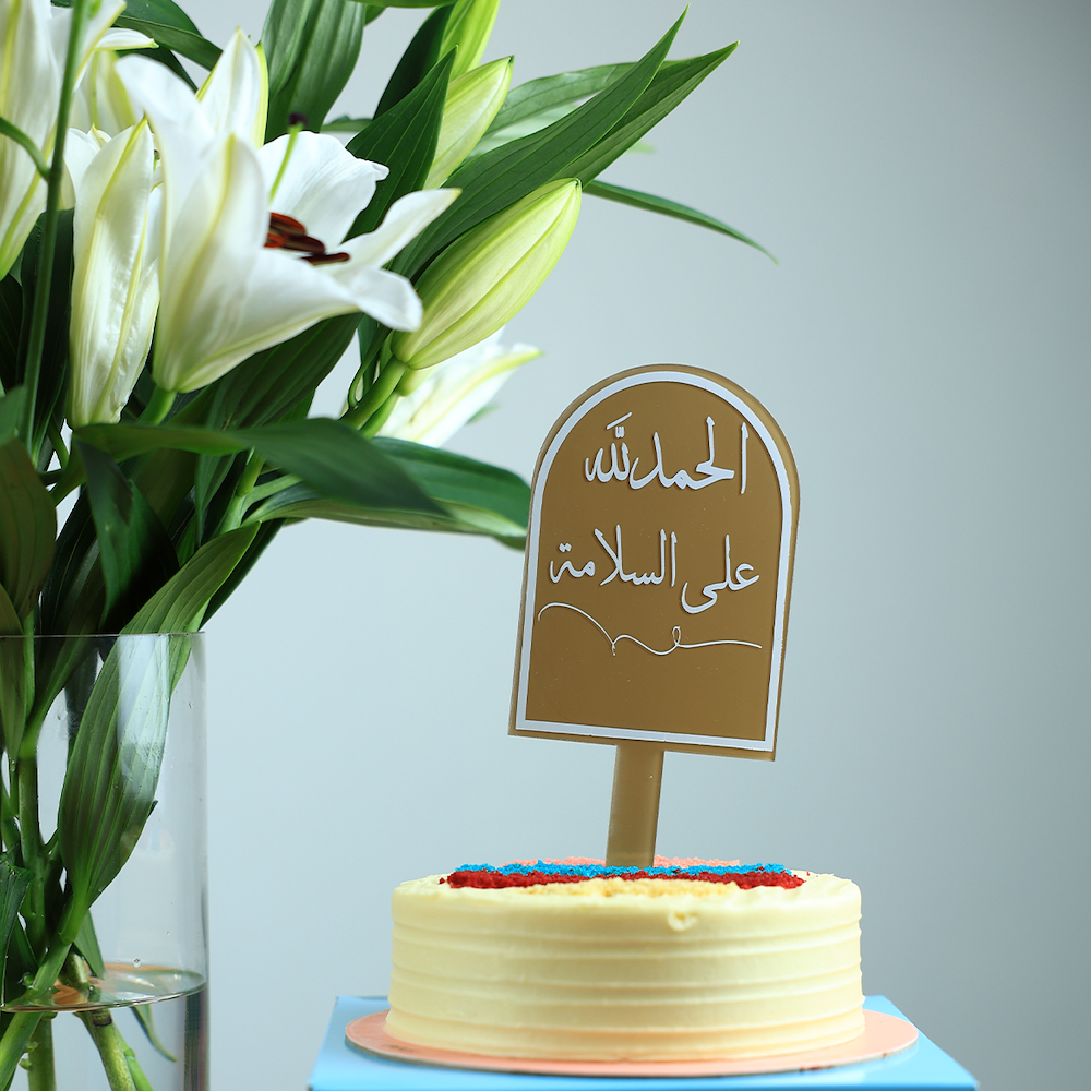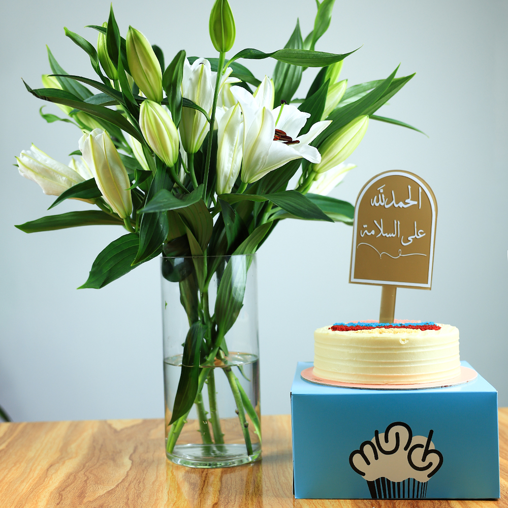 A bouquet of white casablanca flowers, a cake, and an acrylic topper. The cake is from the Munch brand and serves 5-6 people.
