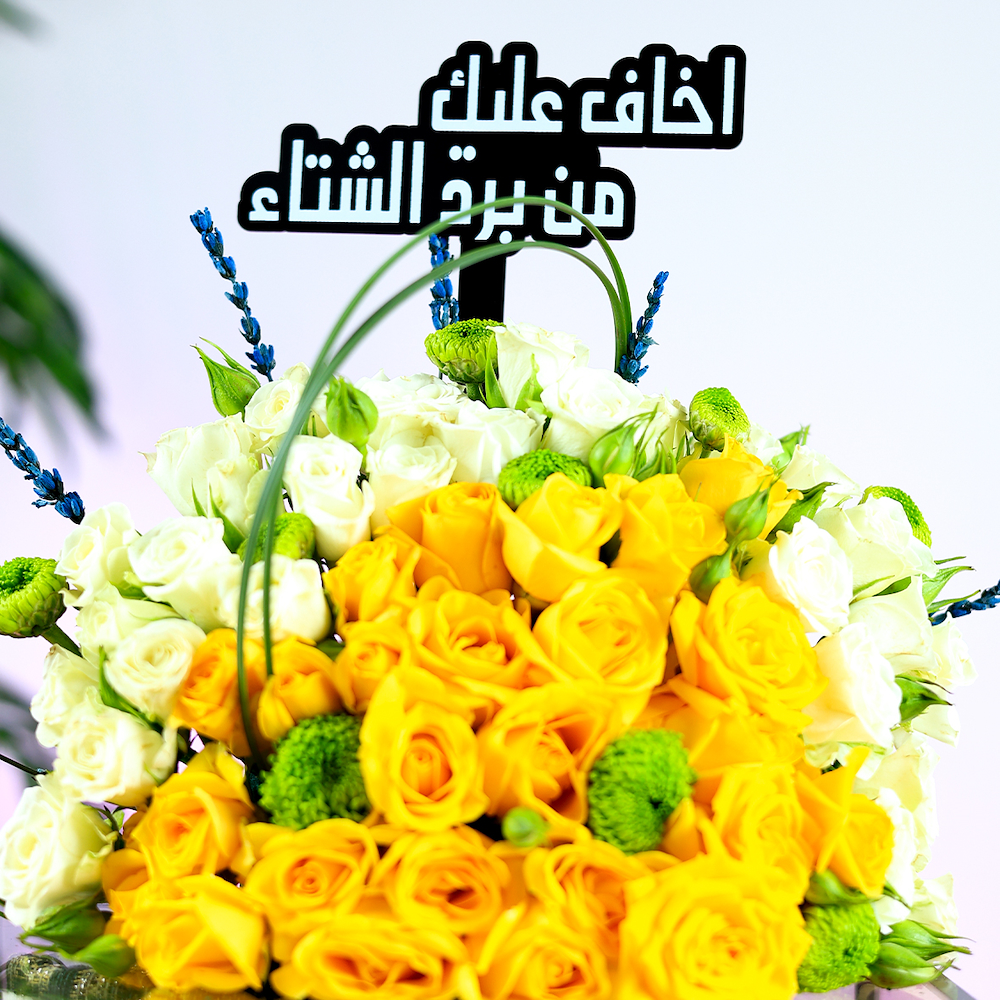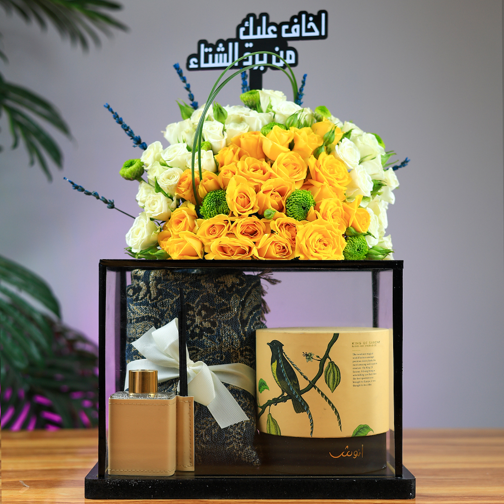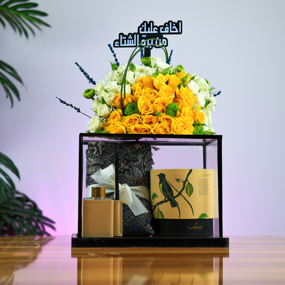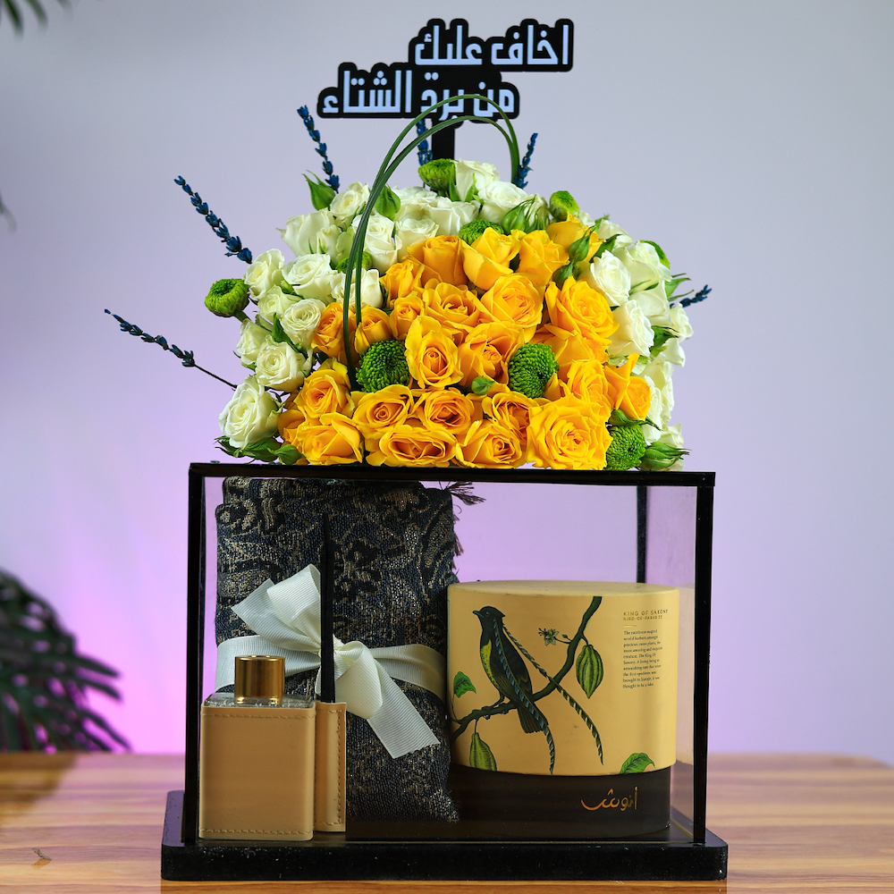 An elegant glass box featuring roses, baby roses, and chrysanthemums with 250g of Anoosh chocolate wafers, a cashmere shawl, a diffuser, and an acrylic topper.