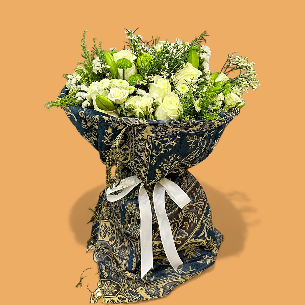 A bouquet containing roses, baby roses, lilies, and chrysanthemums, wrapped beautifully in a Kashmiri scarf.