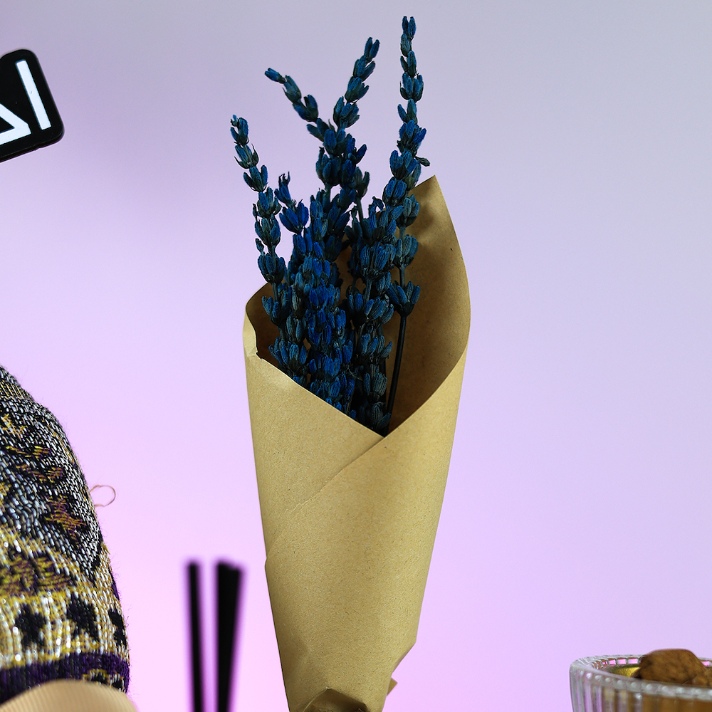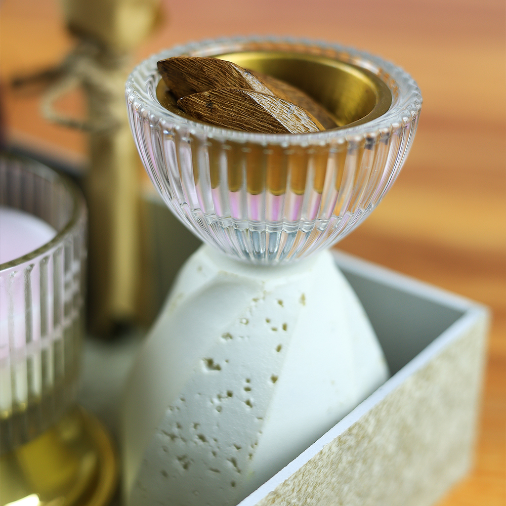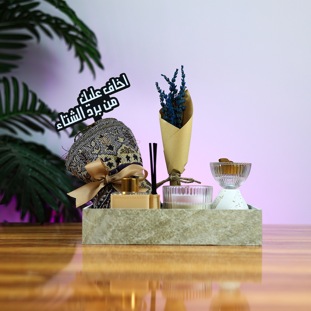 A tray featuring an elegant mubkhar, three pieces of oud, a diffuser, dried lavender flowers, a scented candle, an acrylic topper, and a cashmere shawl.