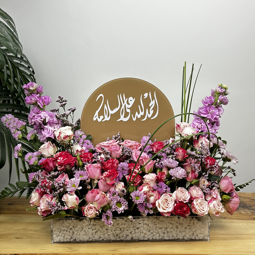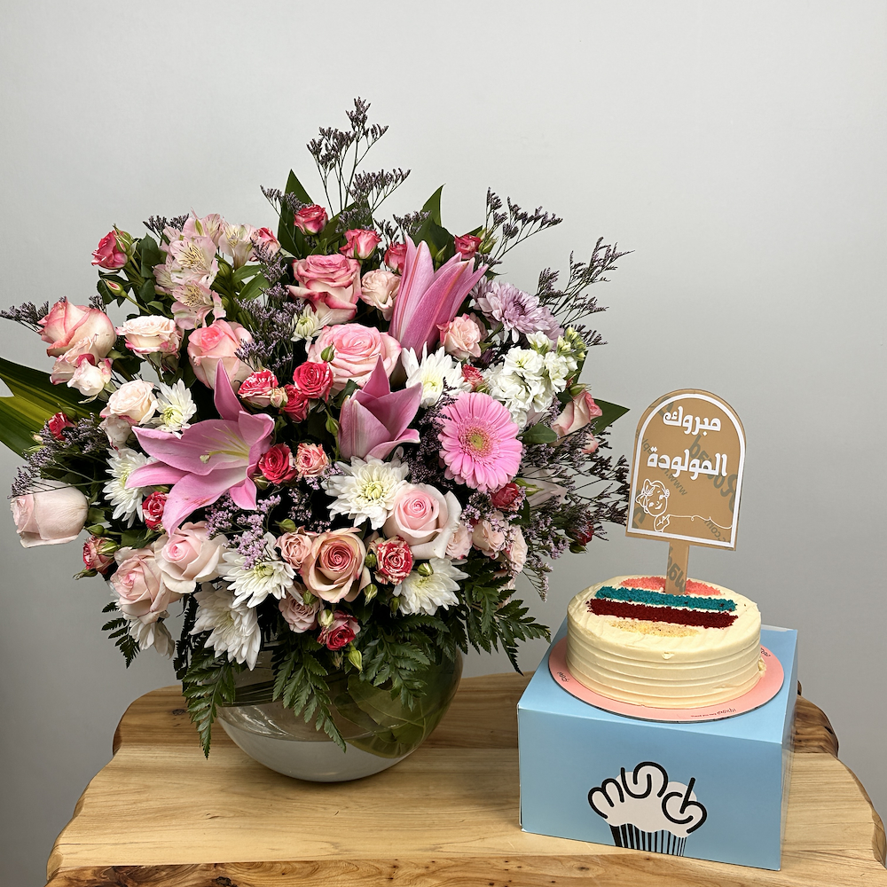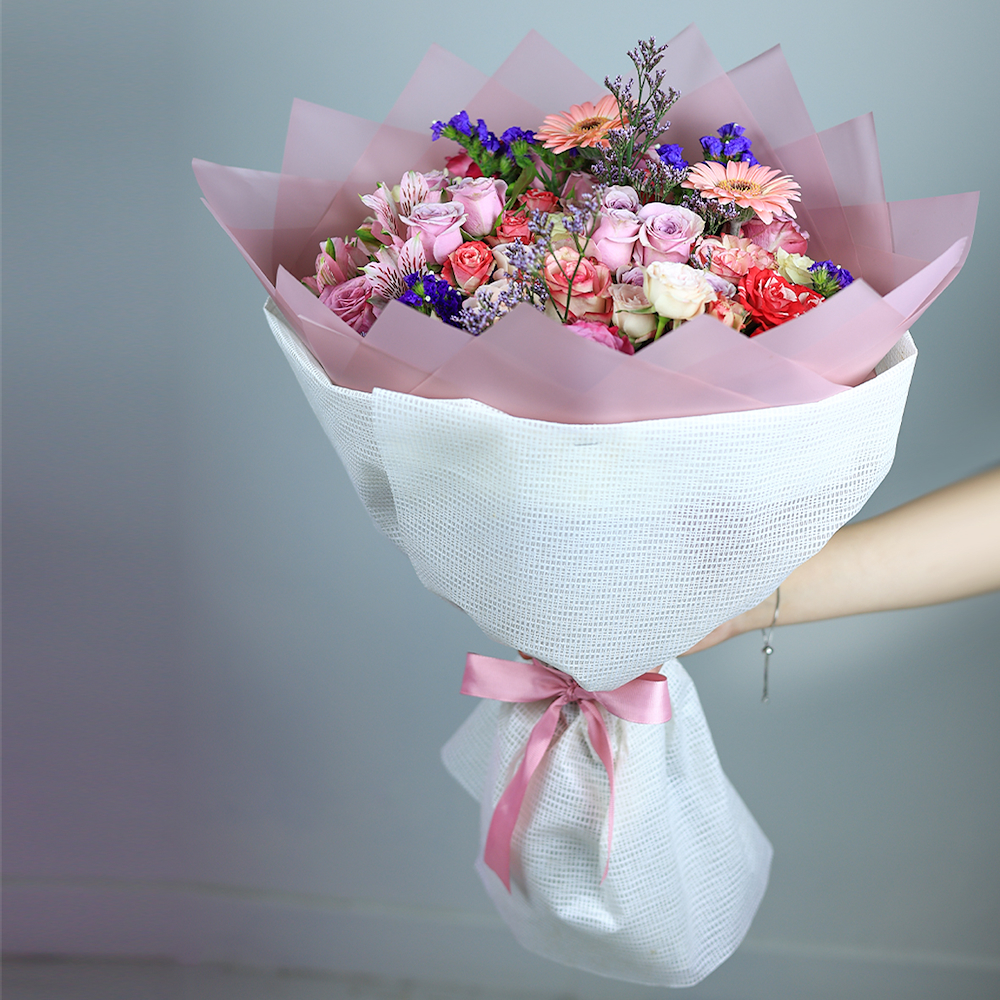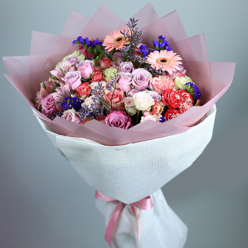 A hand bouquet that contains roses, gerberas, alstroemerias and statice.