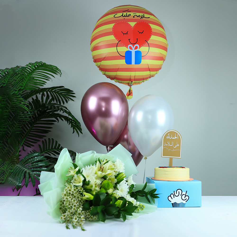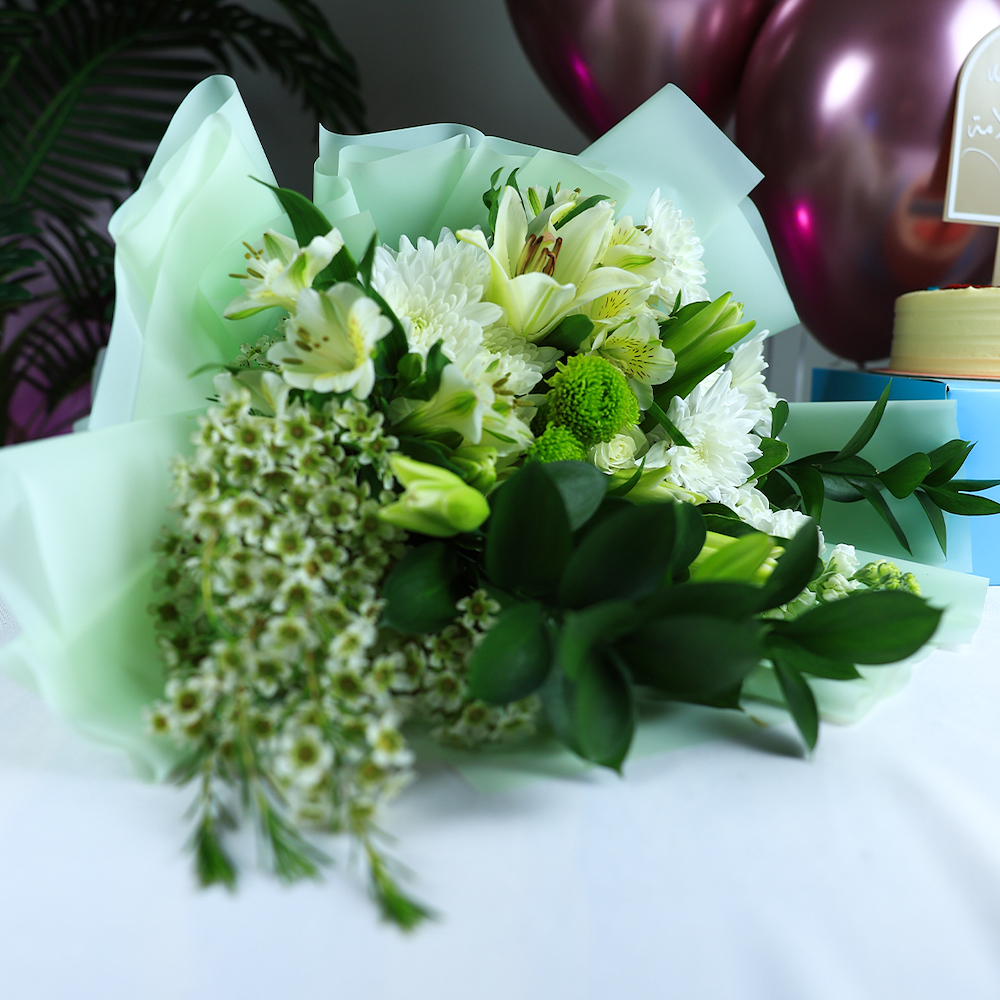 A bouquet of white chrysanthemums and lilies, a medium-sized cake, helium balloons, and an acrylic topper. The cake is from the Munch brand and serves 5-6 people.