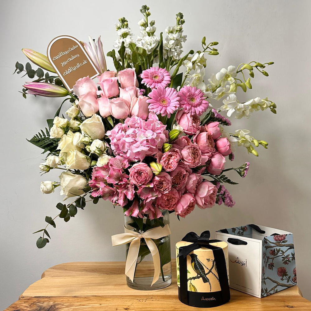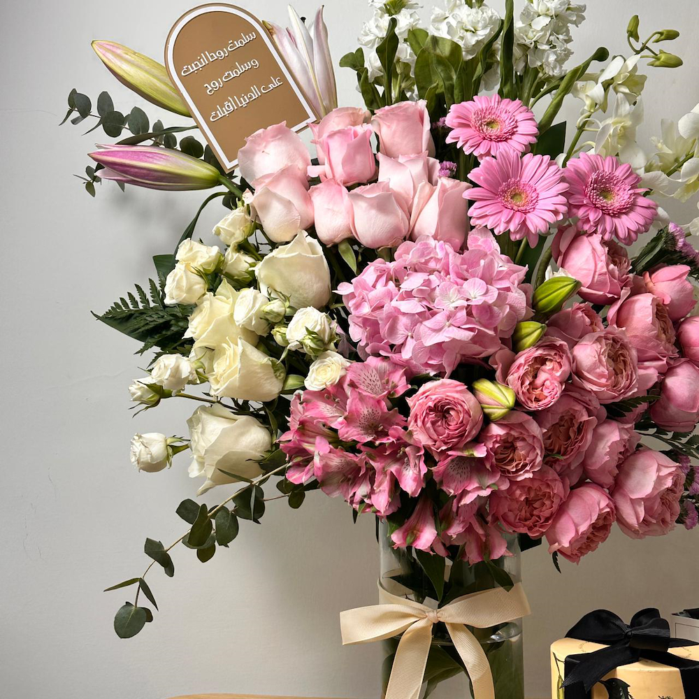A transparent vase arranged with Dutch gerbera, hydrangea, and roses, topped with an acrylic topper and a quarter kilo of Anoush chocolate wafers.