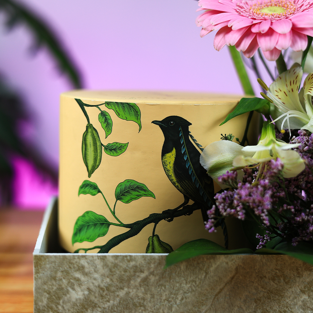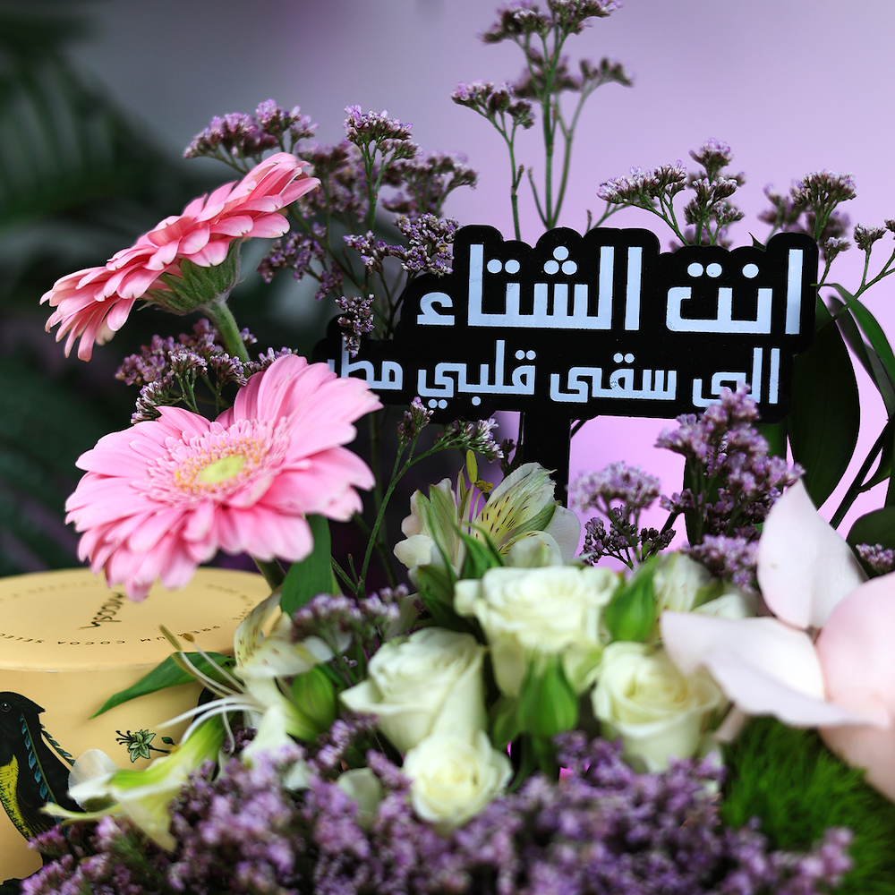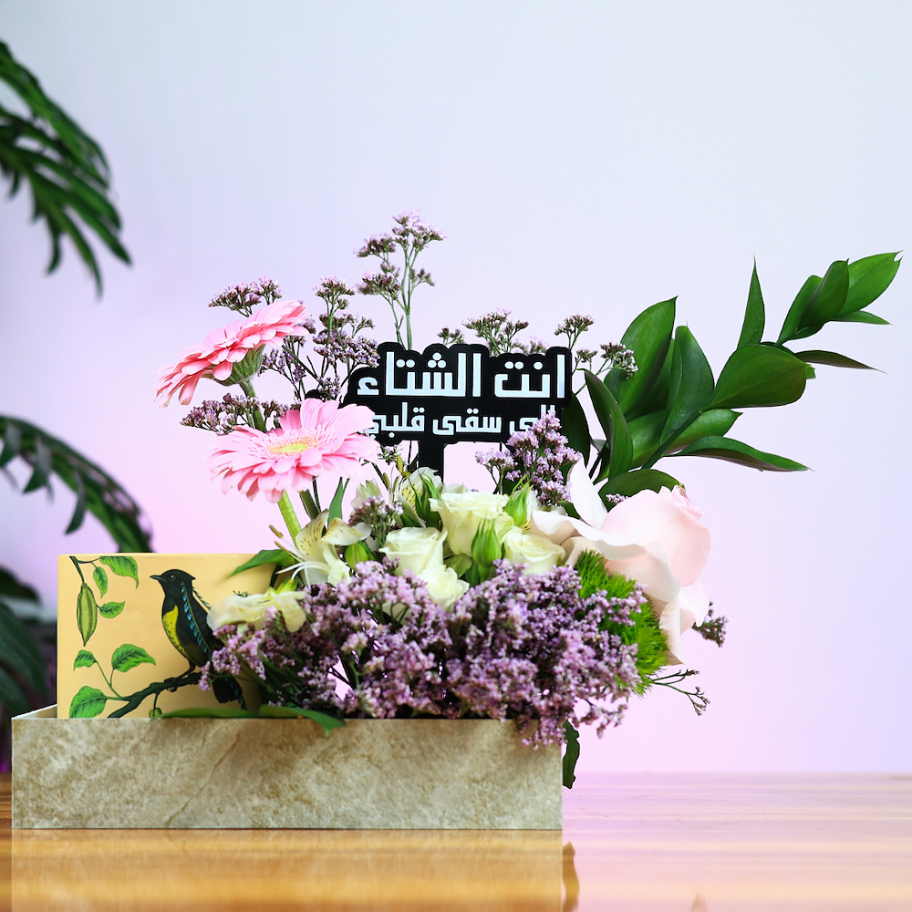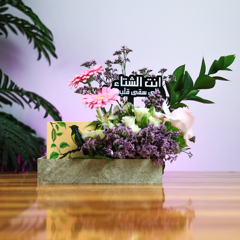 A tray containing natural flowers and a quarter kilo of Anoush brand chocolate wafers, with an acrylic topper.