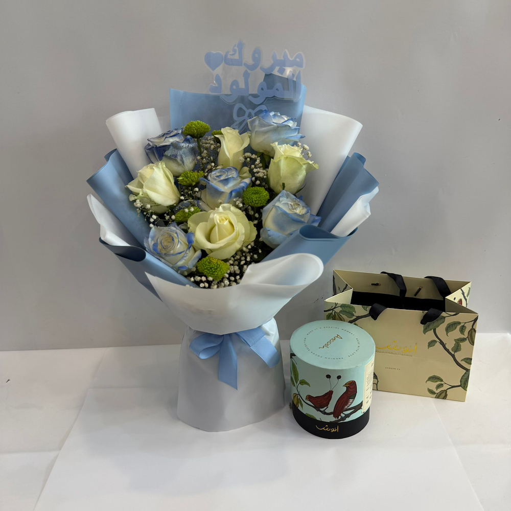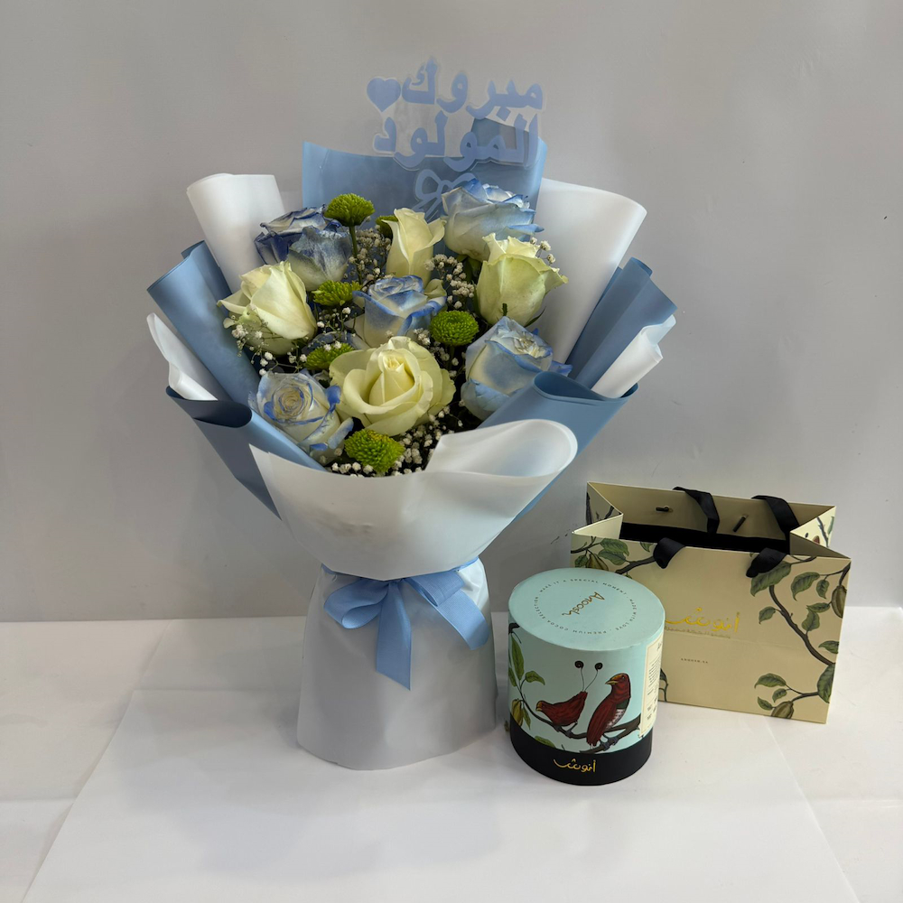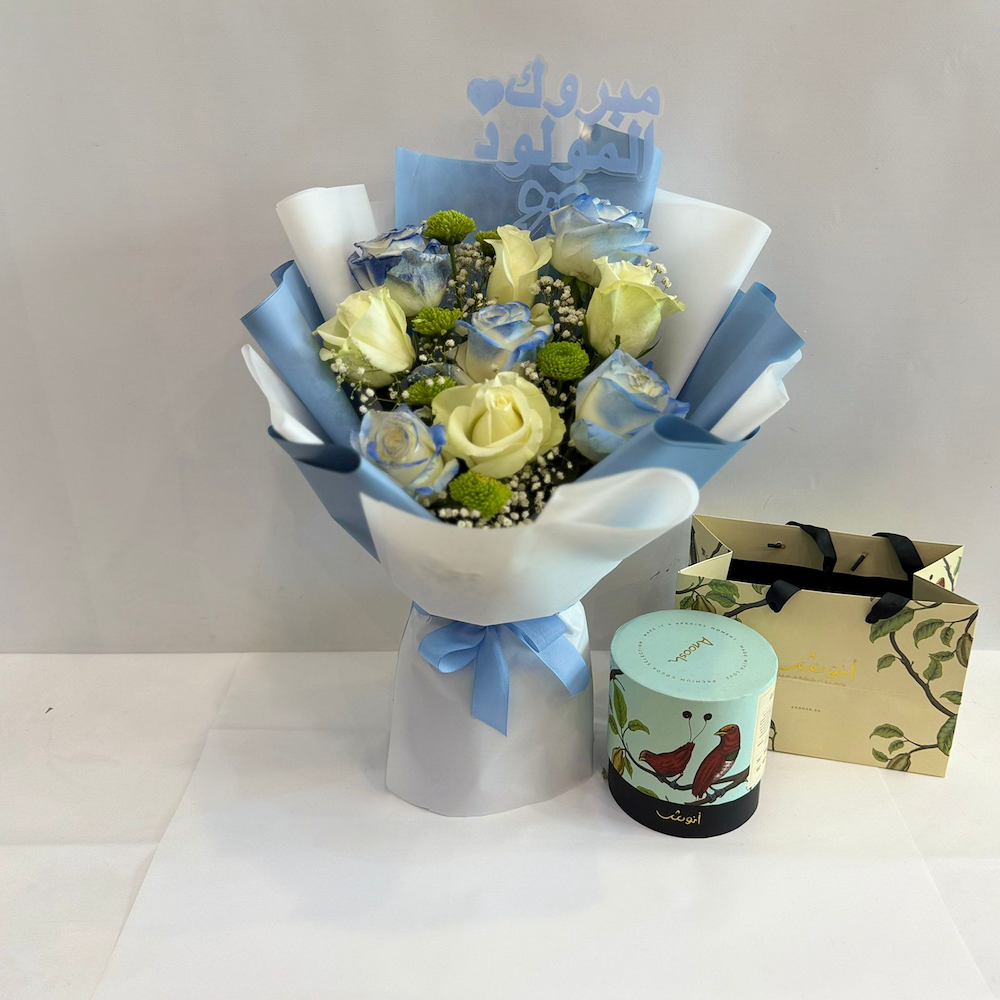 An elegant bouquet featuring roses, gypsophila and chrysanthemum flowers with a baby topper and Anoosh chocolate.