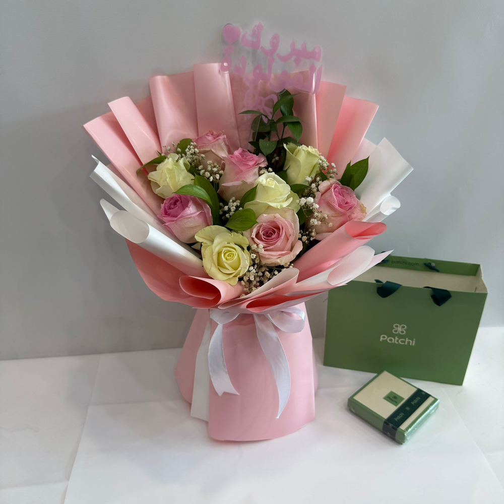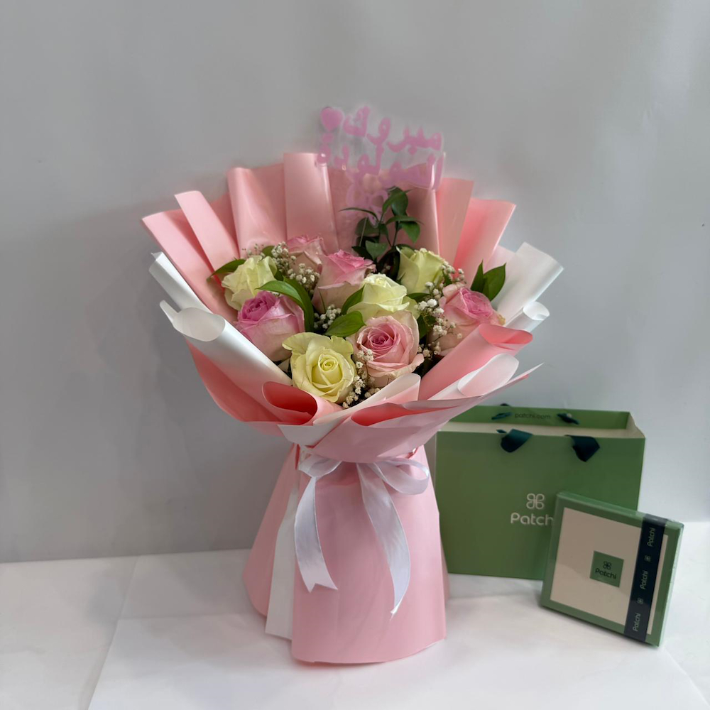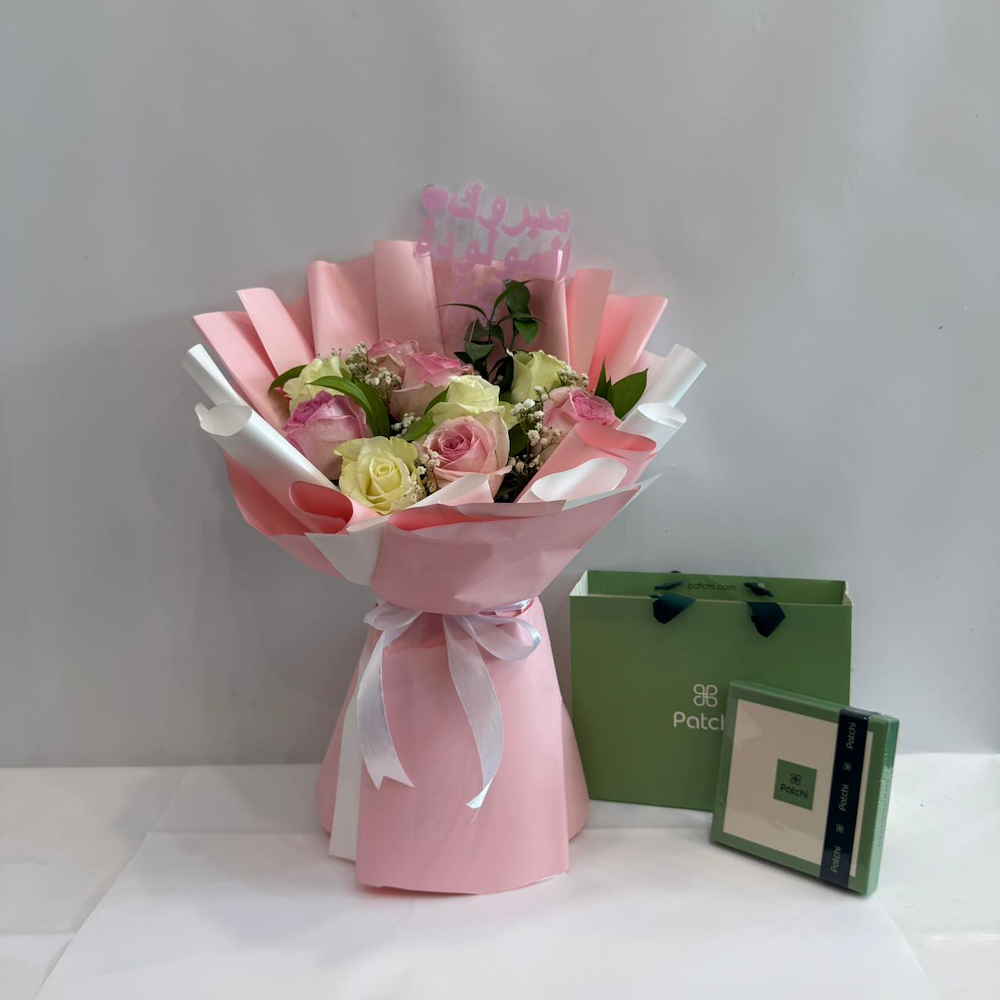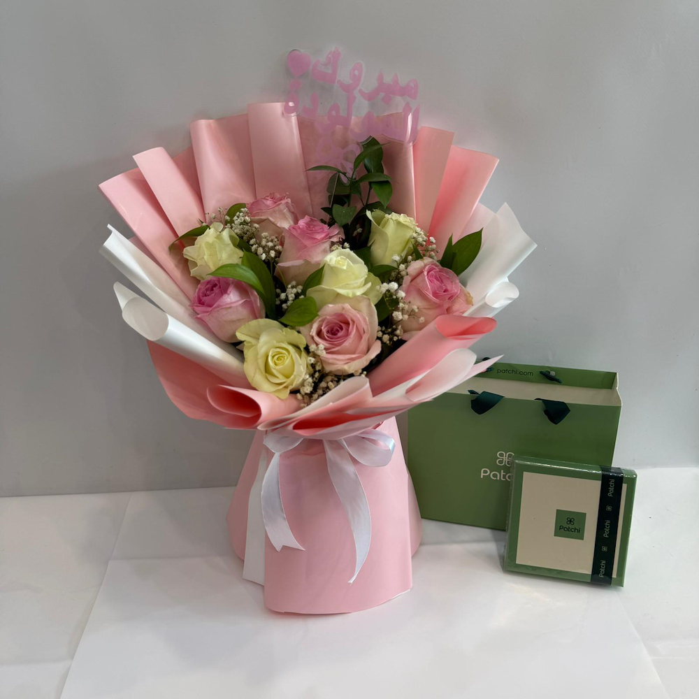 An elegant bouquet featuring roses, gypsophila and chrysanthemum flowers with a baby topper and Patchi chocolate.