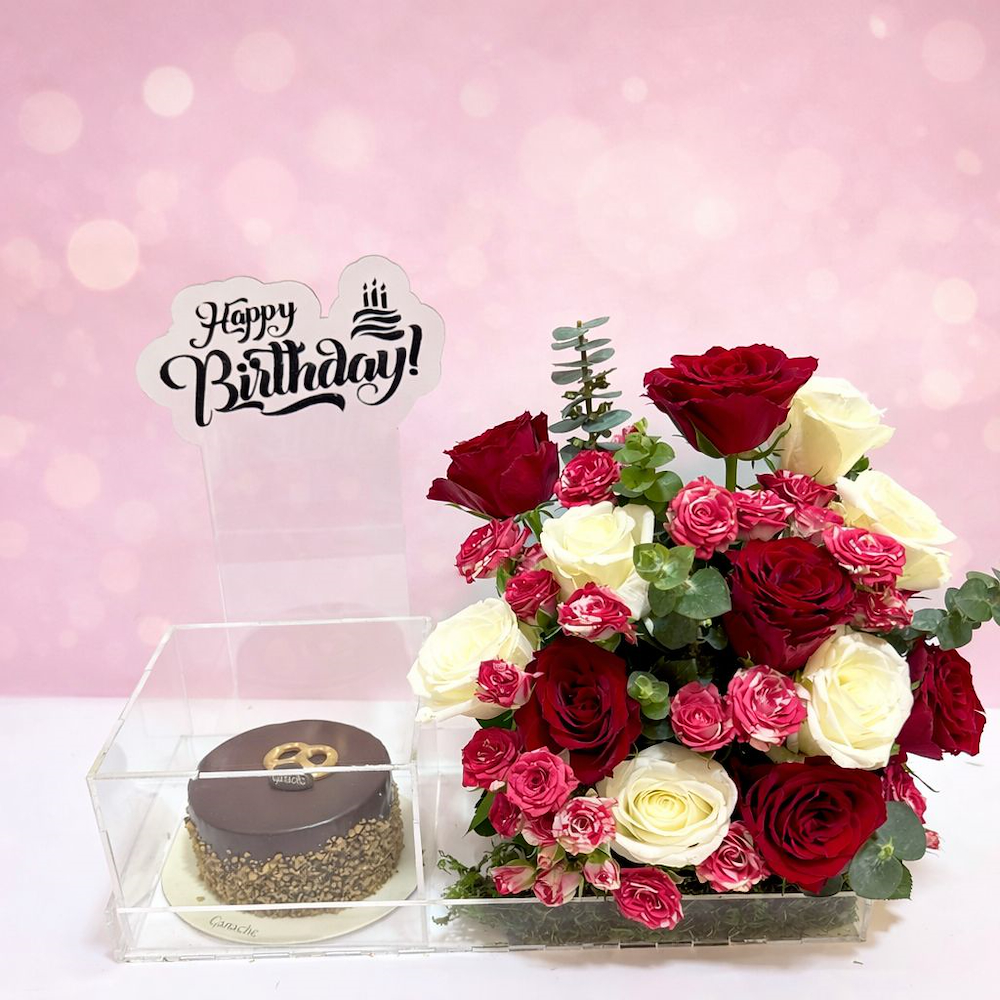 An elegant tray featuring roses and baby roses with a luxurious Ganache cake.