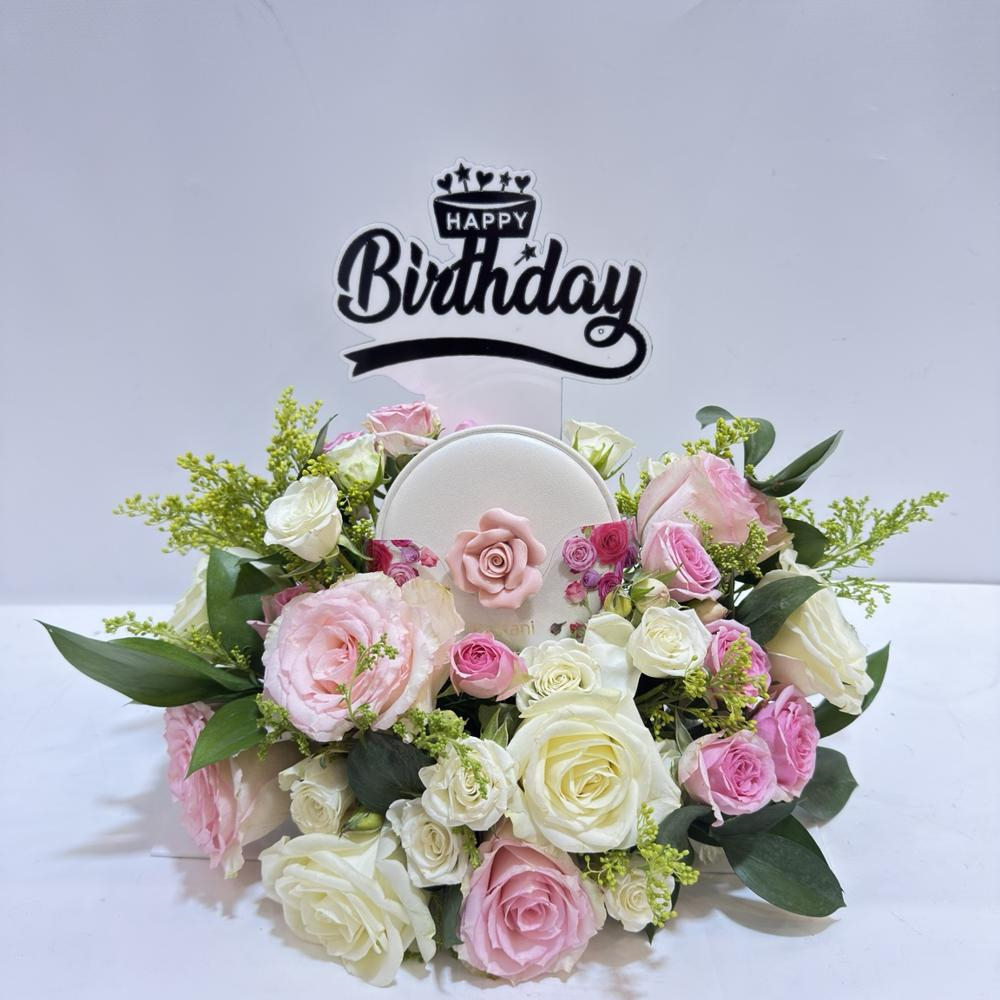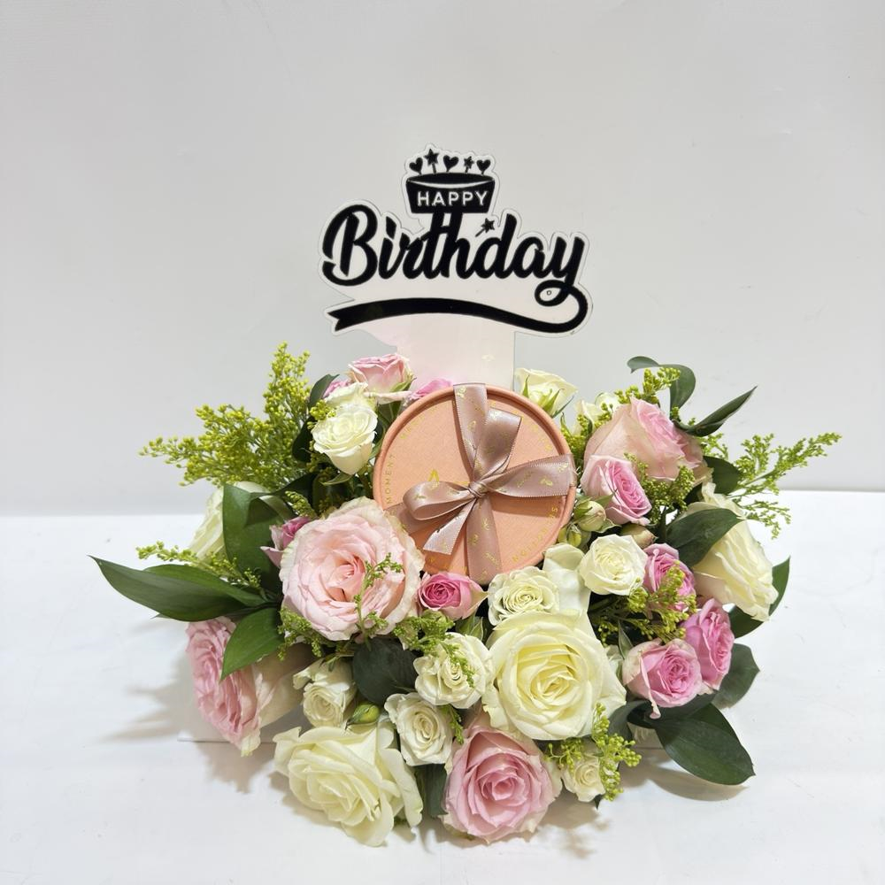 An elegant centerpiece featuring roses and baby roses with Anoosh chocolates and a topper.