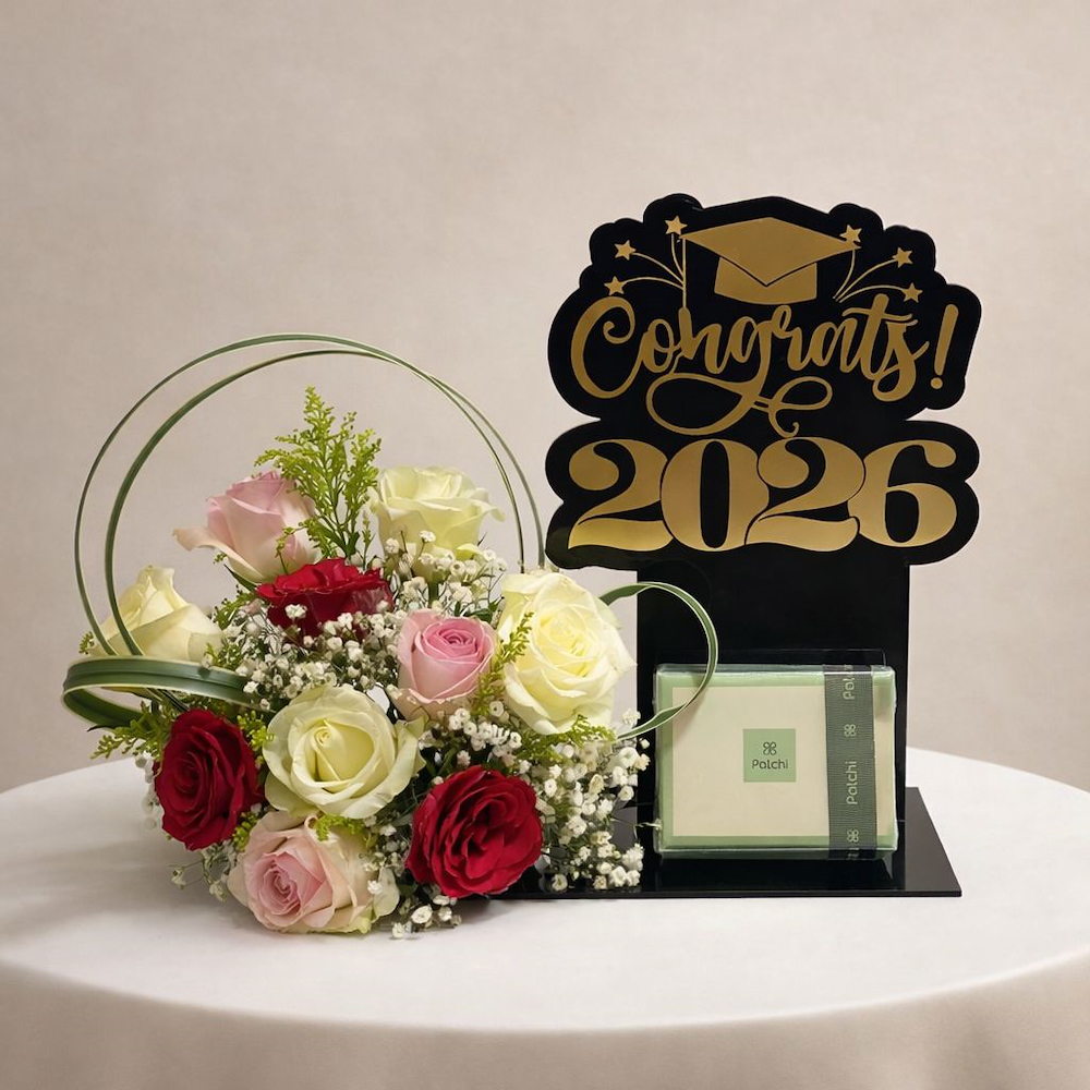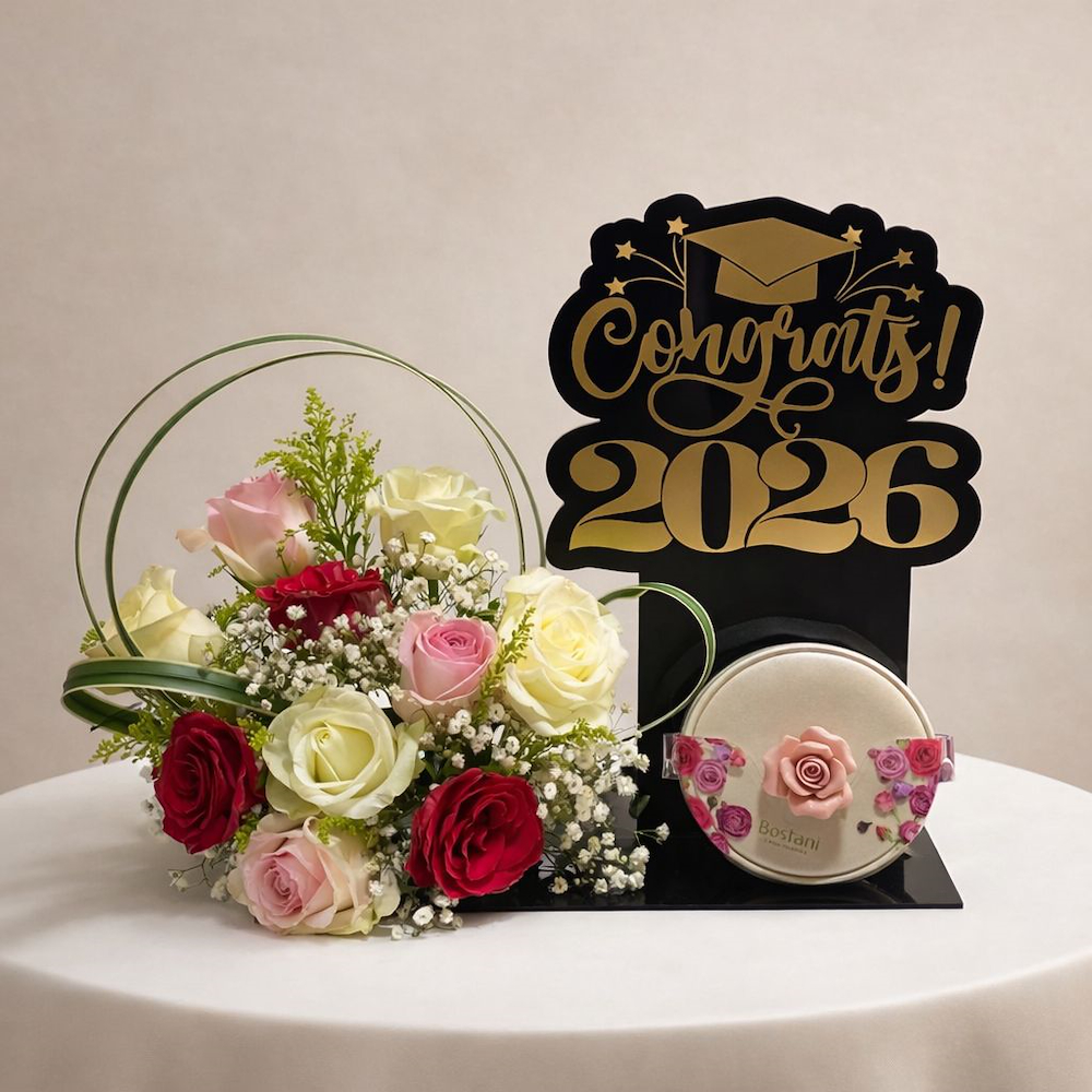 A tray featuring roses and gypsophila flowers with a graduation topper.