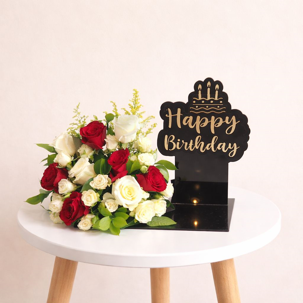 An elegant birthday tray featuring fresh flowers and a gift box with a “Happy Birthday” sign, perfect for special surprises.
