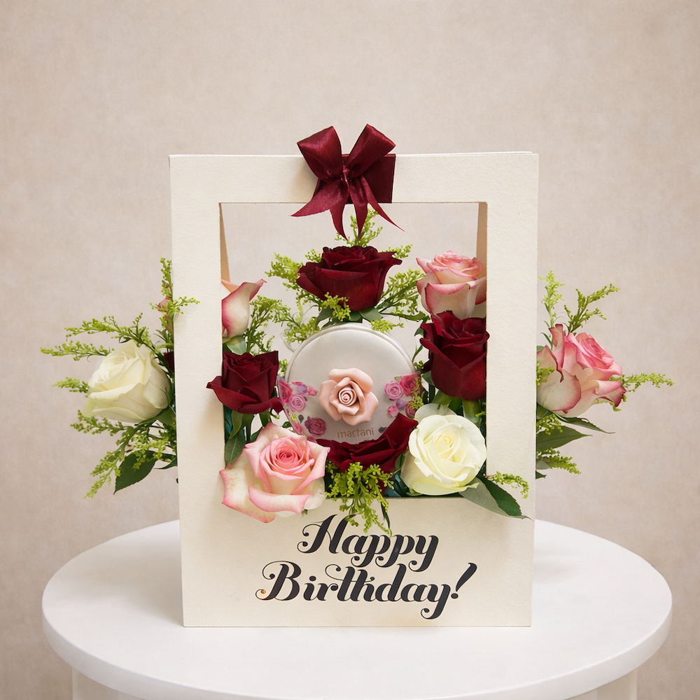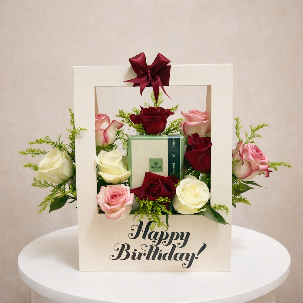 A box that contains roses along with Patchi chocolates.