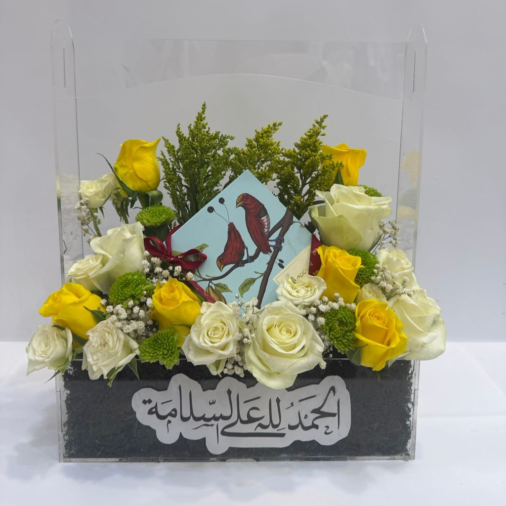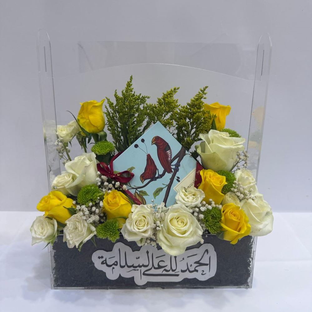 An elegant acrylic stand featuring roses and baby roses with Anoosh chocolate.