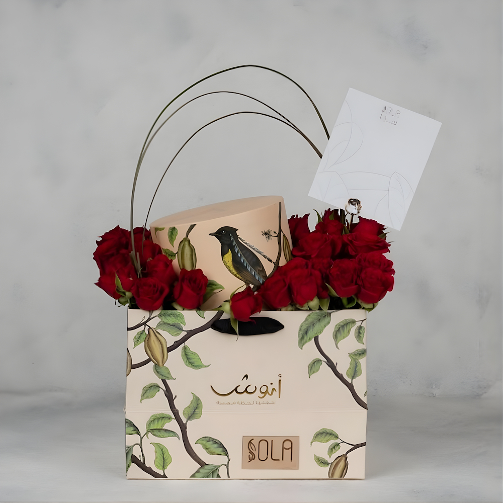 A bouquet containing red roses, arranged beautifully in a box. Comes with a box of chocolates from Anoosh. Care instructions: Change the water every two days with cool water. Prune the stem tip at an angle every two days. Suitable temperature: 16-20°C