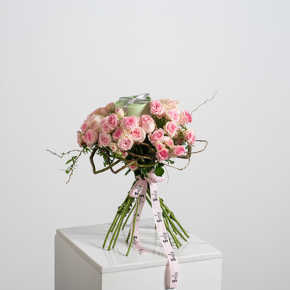An elegant hand bouquet that contains baby roses along with 150g of Anoosh chocolates.