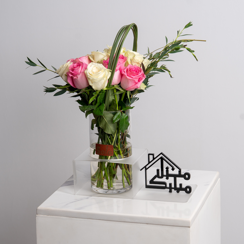 A vase containing white and pink roses, arranged in an acrylic stand. Care Instructions: Change the water every two days with cold water. Trim the stem tip at an angle every two days. Suitable temperature: 16-20°C.