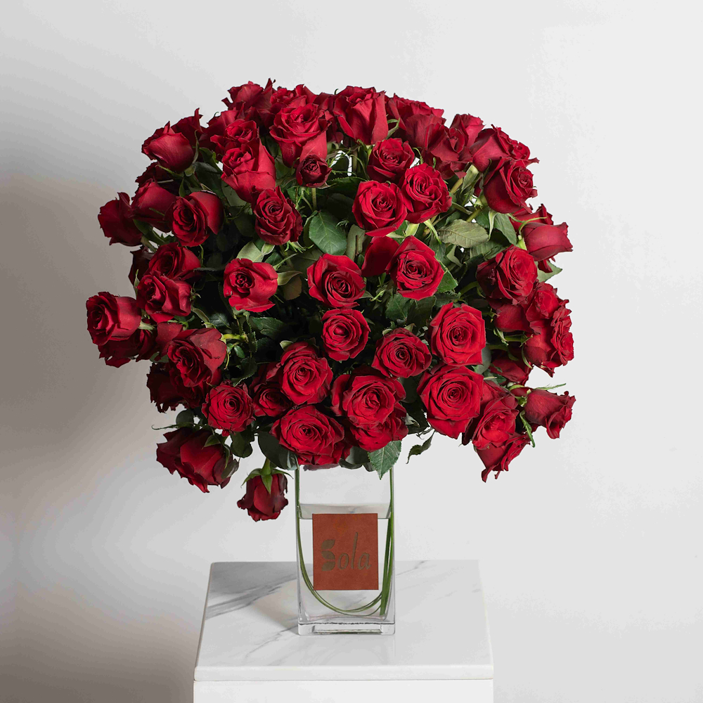 A bouquet containing red roses, arranged beautifully in a vase. Care Instructions: Change the water every two days with cold water. Trim the stem tip at an angle every two days. Suitable temperature: 16-20°C.