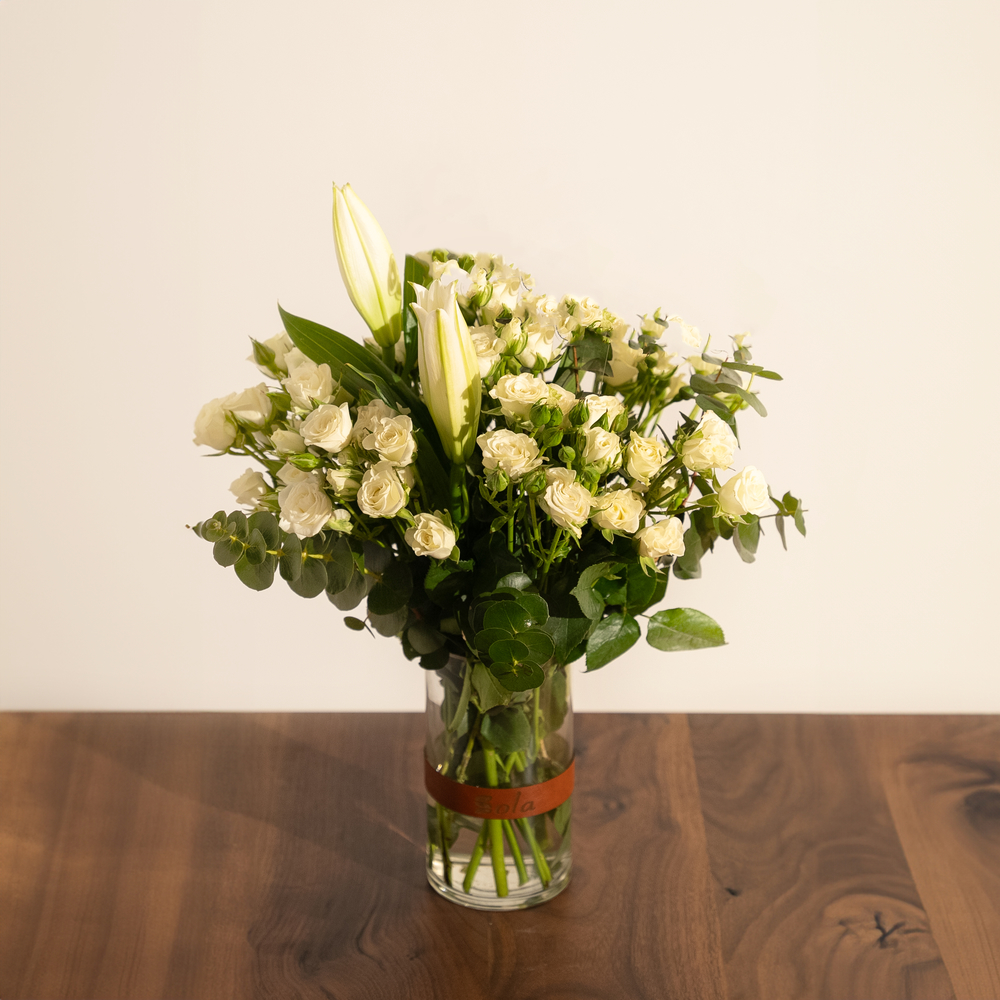A bouquet containing white baby roses and lilies, arranged in a vase. Care Instructions: Change the water every two days with cold water. Trim the stem tip at an angle every two days. Suitable temperature: 16-20°C.