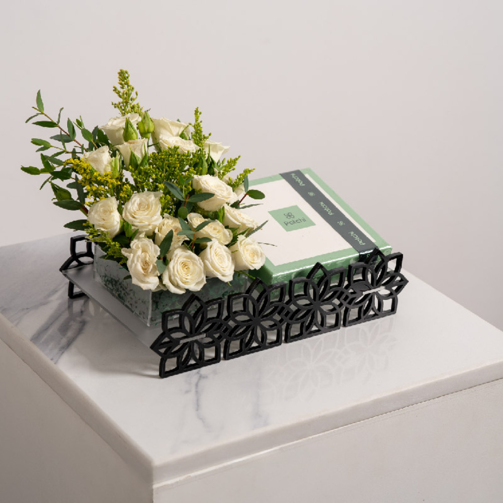 A tray that contains roses along with Patchi Deli Gourmet chocolates.
