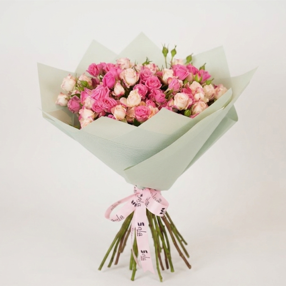 A hand bouquet containing pink baby roses, arranged beautifully. Care instructions: Change the water every two days with cool water. Prune the stem tip at an angle every two days. Suitable temperature: 16-20°C