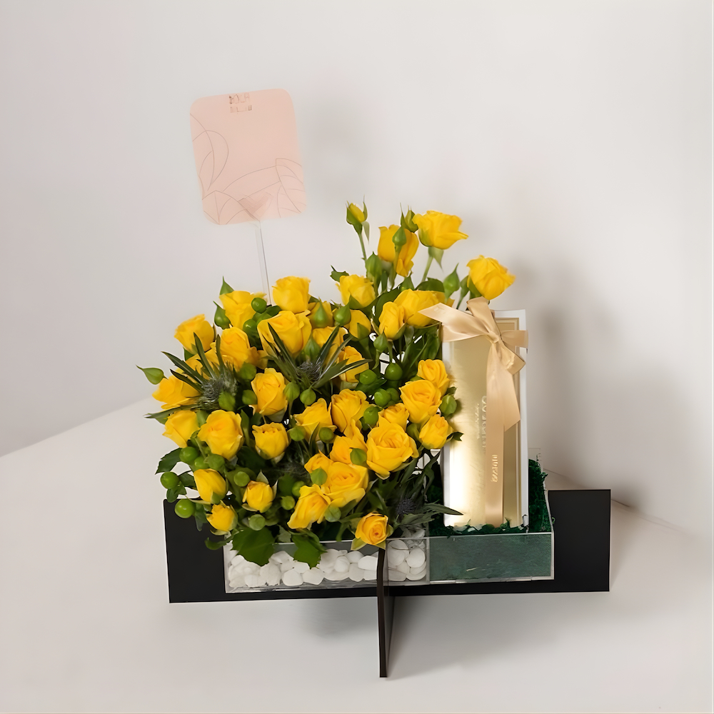 A bouquet containing yellow roses, arranged beautifully in a stand. Comes with chocolates from Bostani. Care instructions: Change the water every two days with cold water. Trim the stem tip at an angle every two days. Suitable temperature: 16-20°C.
