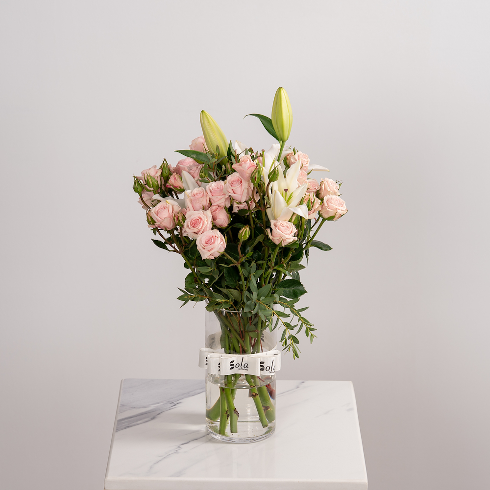 A bouquet containing pink baby roses and white lilies, arranged in a vase. Care Instructions: Change the water every two days with cold water. Trim the stem tip at an angle every two days. Suitable temperature: 16-20°C.