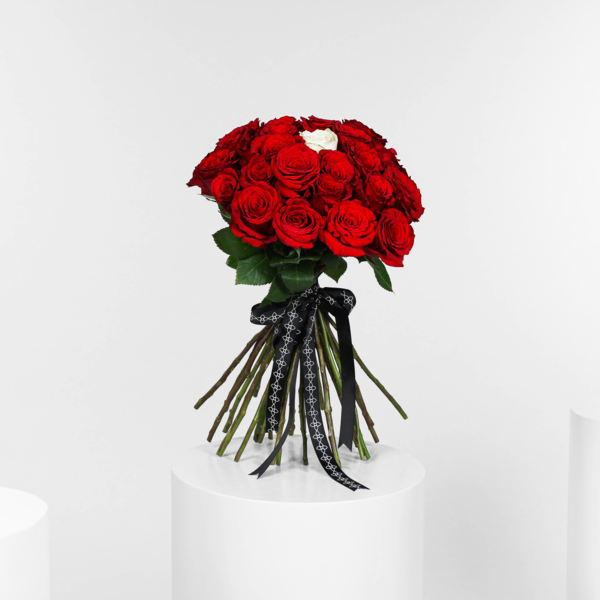 A bouquet filled with red roses and Patchi chocolate bar.