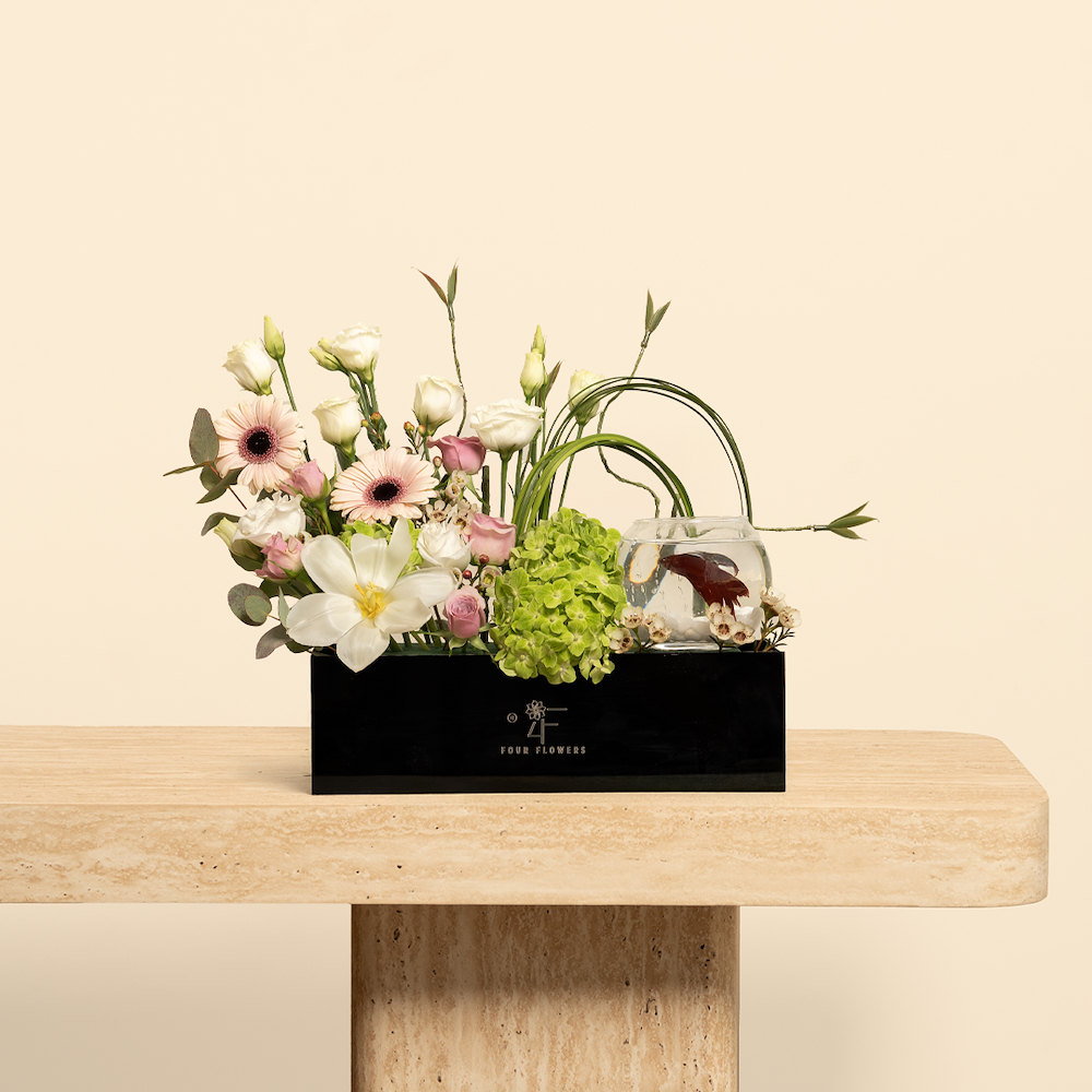 A box filled with roses and eucalyptus along with Moroccan oud.