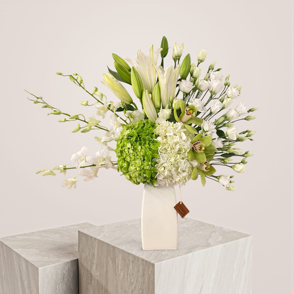 A vase filled with hydrangea, baby roses, baby orchids, lilies and cymbidium flowers.